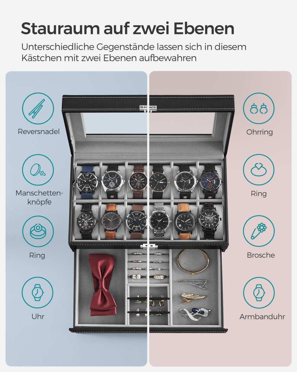 Elegáns kétrétegű óratartó doboz 12 óra tárolására, fiókkal kiegészítők számára, üvegfedéllel és zárható kivitelben.