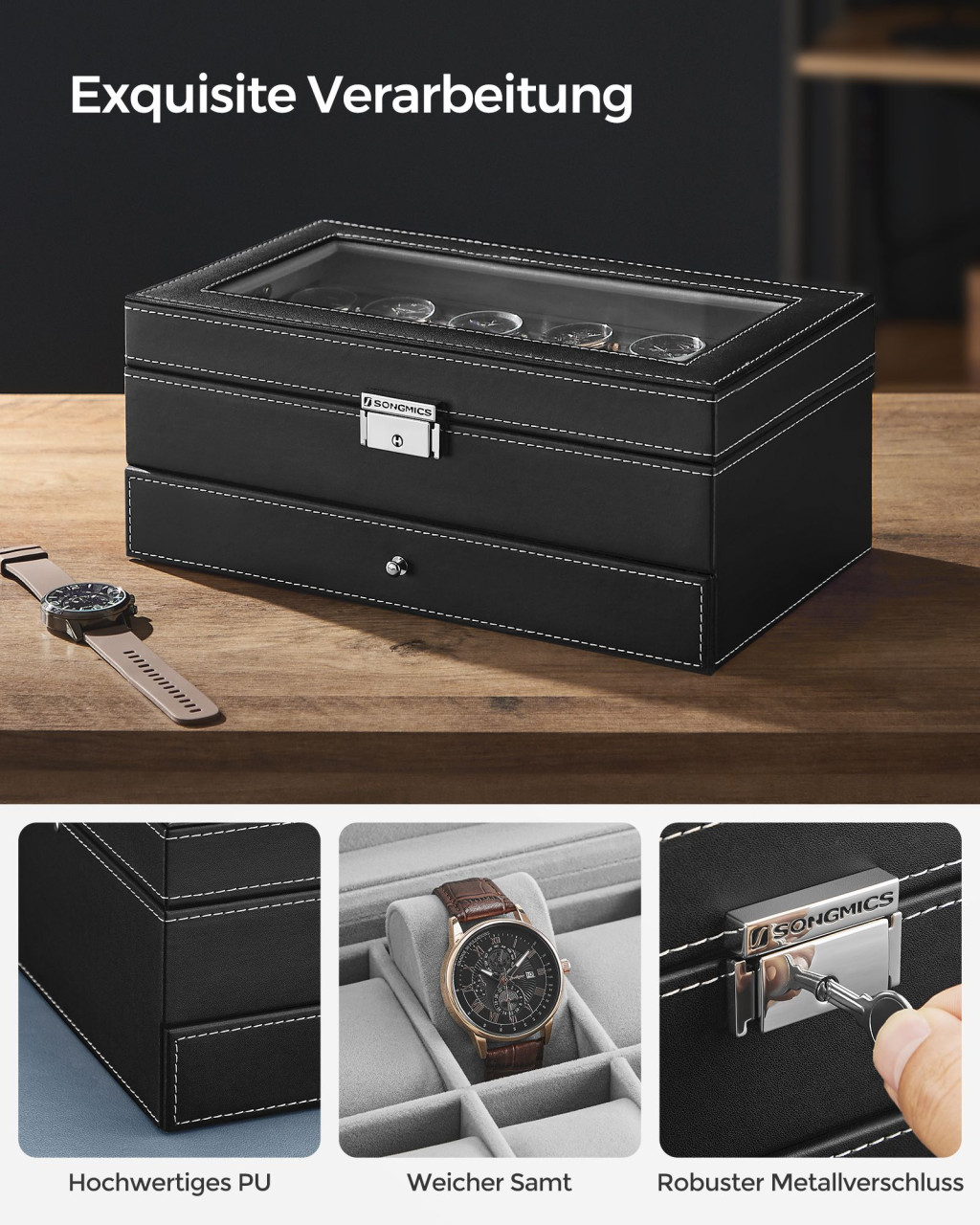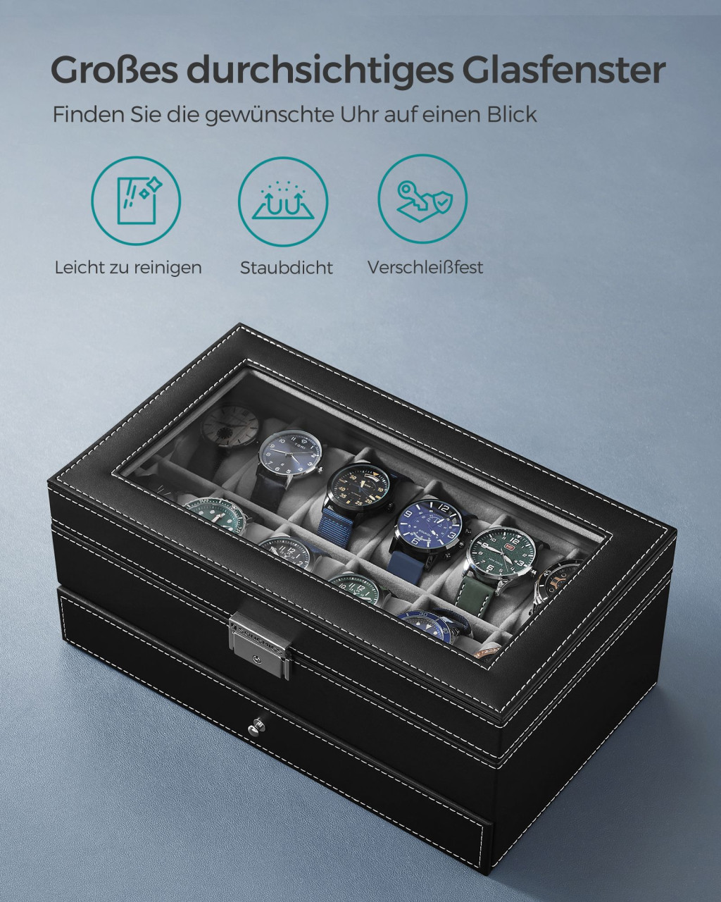 • Üvegfedél: Pormentesen tárolhatók és könnyen áttekinthetők az órák