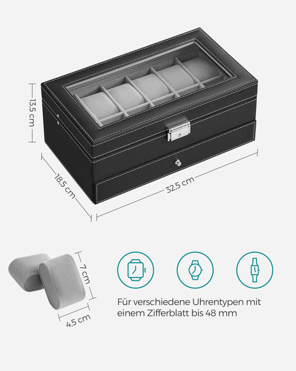 A minőségi műbőr borítás és a szürke bársony belső nem csak elegáns megjelenést biztosít, de védi is az értékes darabokat. Az üvegfedél lehetővé teszi az órák könnyű áttekintését, miközben óvja őket a portól.