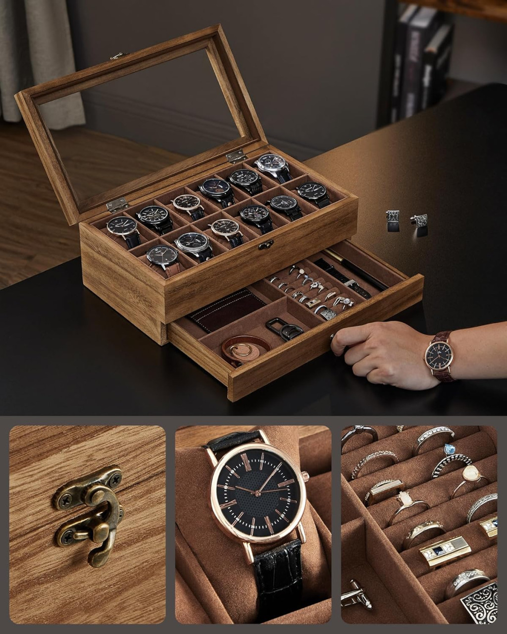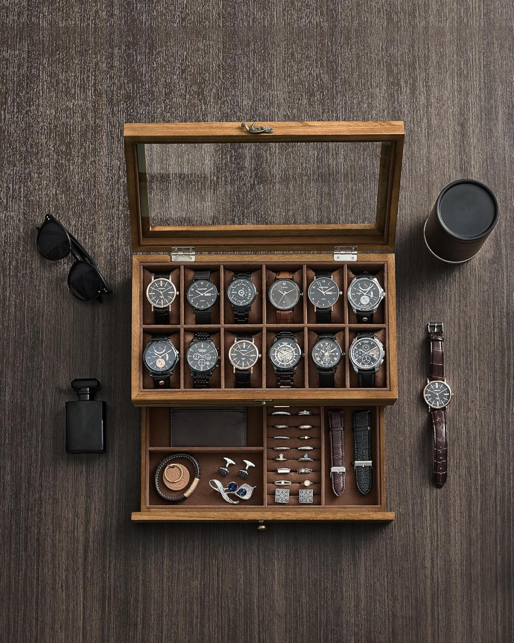 Elegáns, kétszintes óratartó doboz 12 óra tárolására, plusz fiókkal ékszereknek, bársonyos béléssel és üveg tetővel.