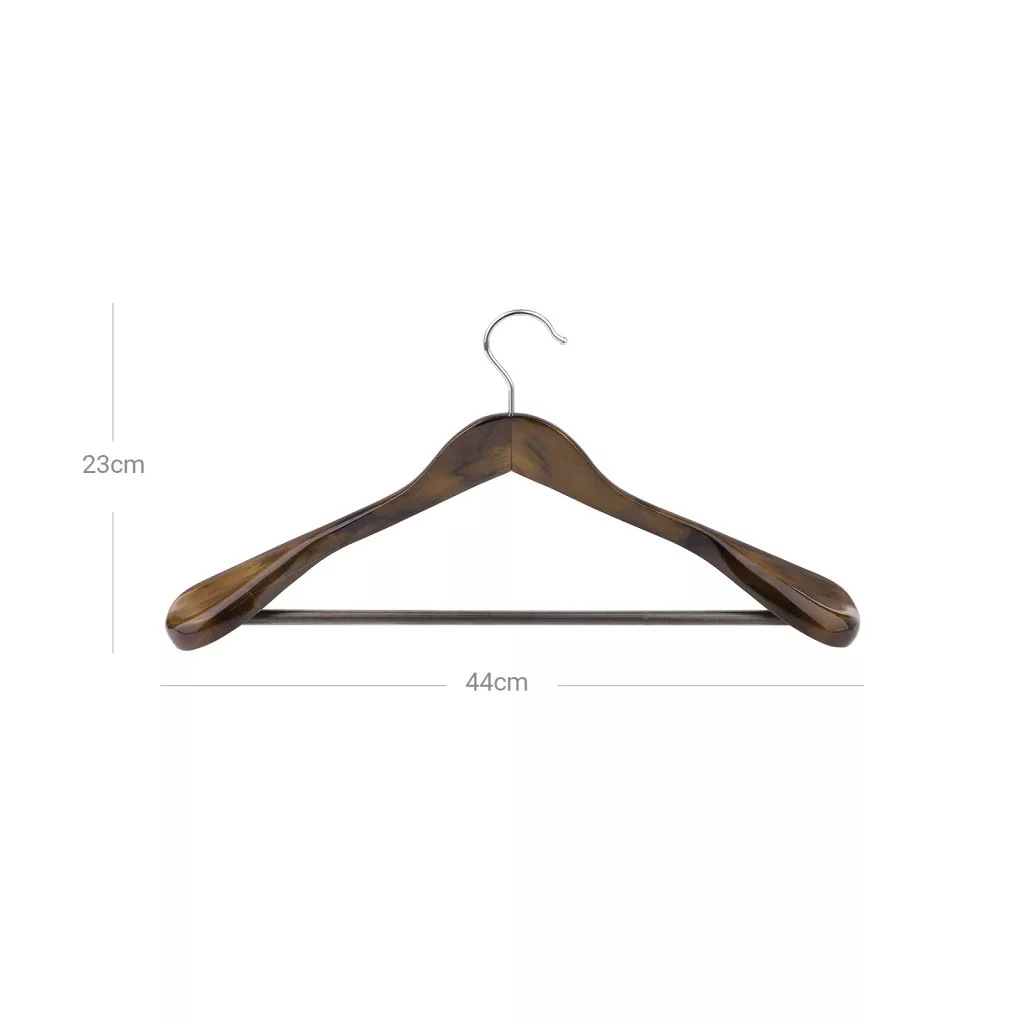 Prémium minőségű, tömörfa vállfakészlet széles vállrésszel és csúszásgátló nadrártartó rúddal, ideális öltönyök és kabátok tárolásához.