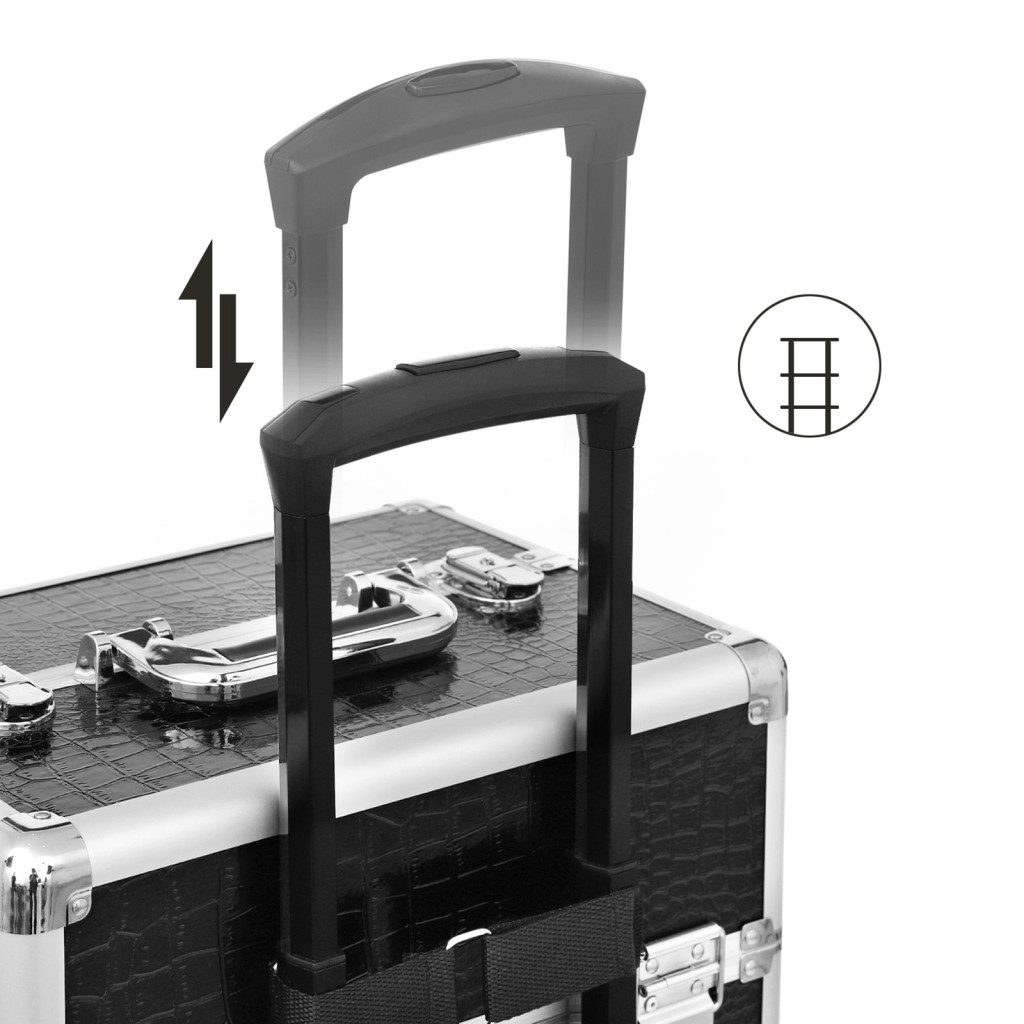 Ez a prémium minőségű, 4 rétegű gurulós sminkbőrönd tökéletes megoldást nyújt a kozmetikai termékek és eszközök rendszerezett tárolására. Az alumínium váz és a krokodilbőr mintázatú PU borítás egyesíti a stílusos megjelenést a tartóssággal.