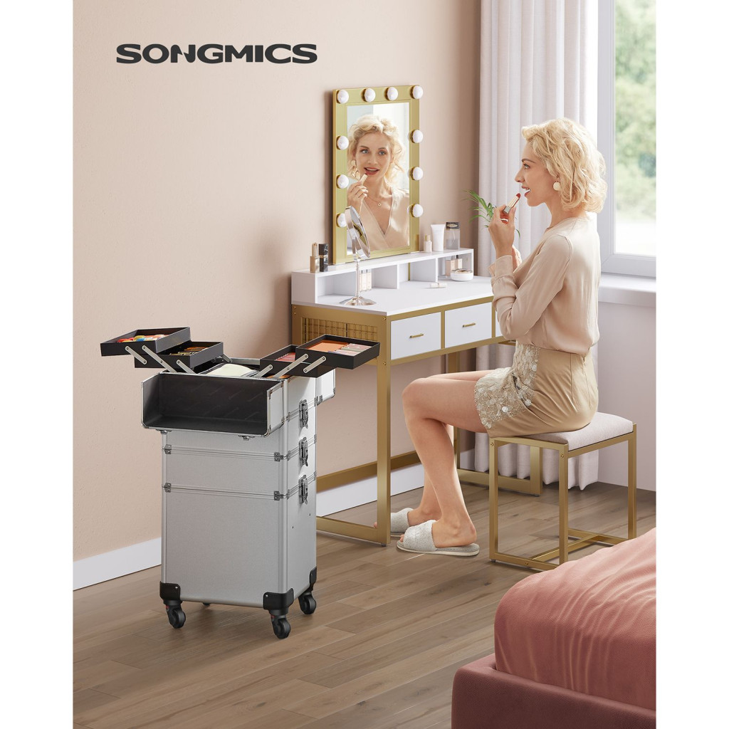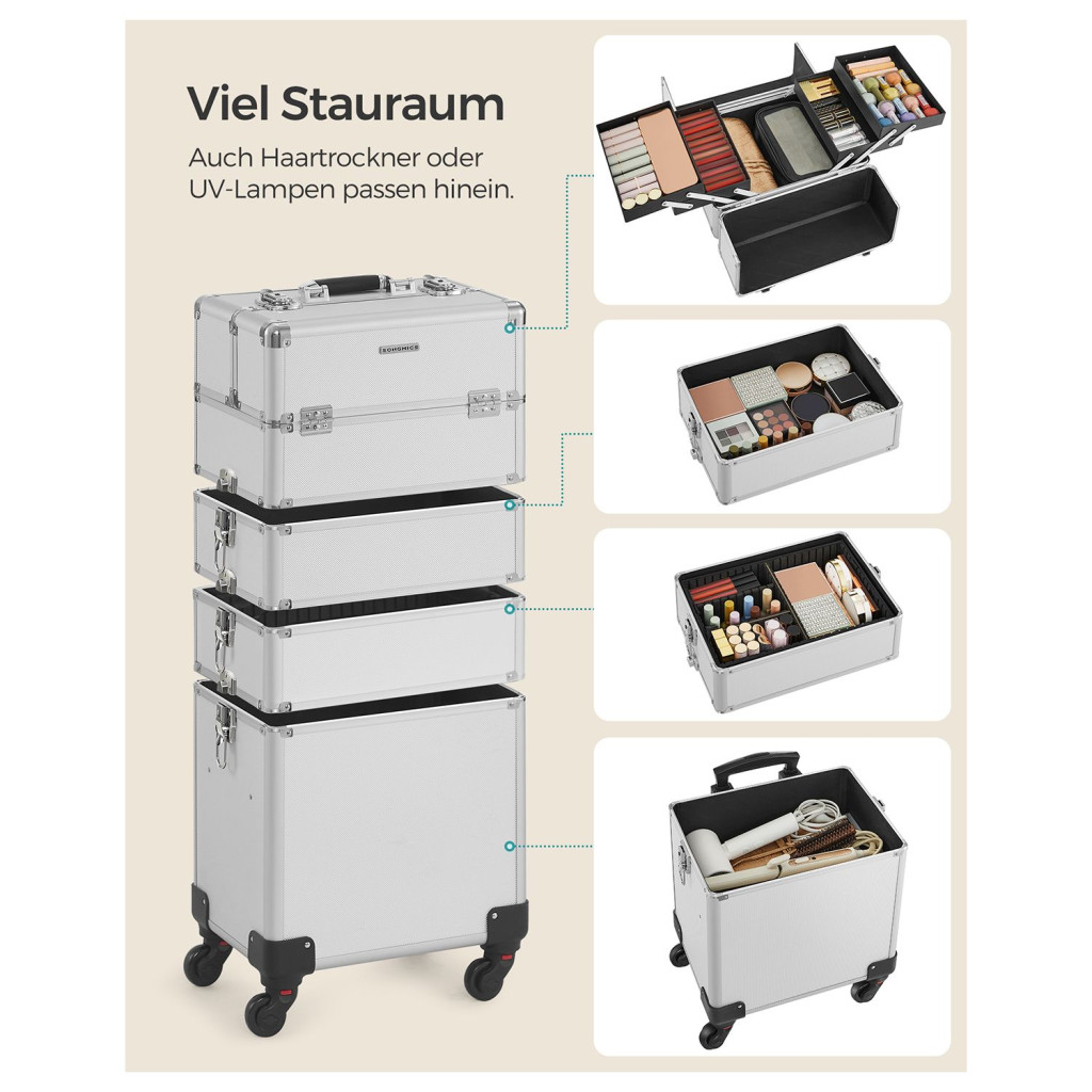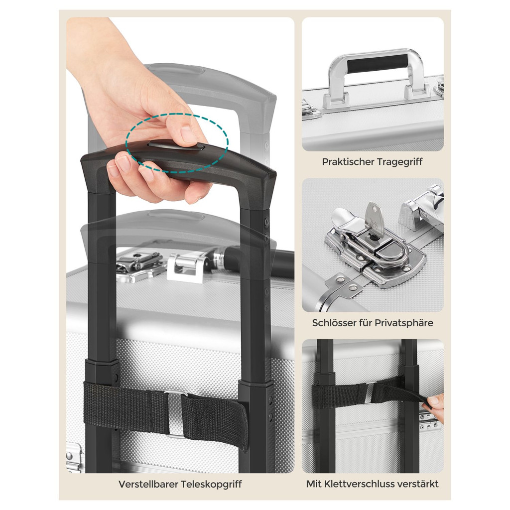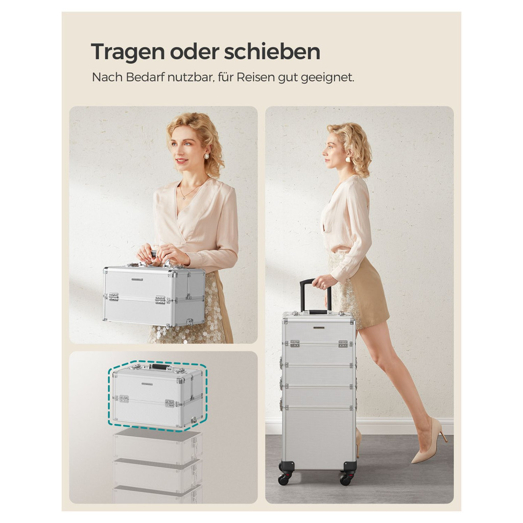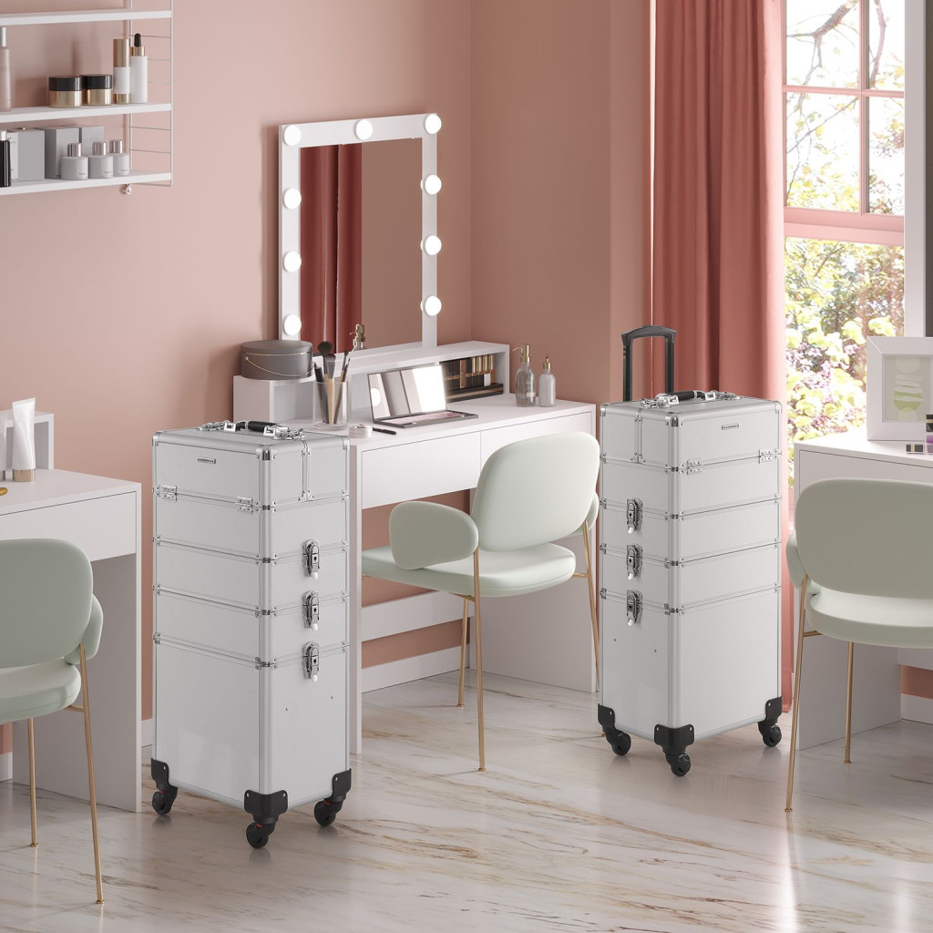 SONGMICS Professzionális Kozmetikai Bőrönd Alumínium Ezüst 4-az-1-ben Gurulós Sminktáska