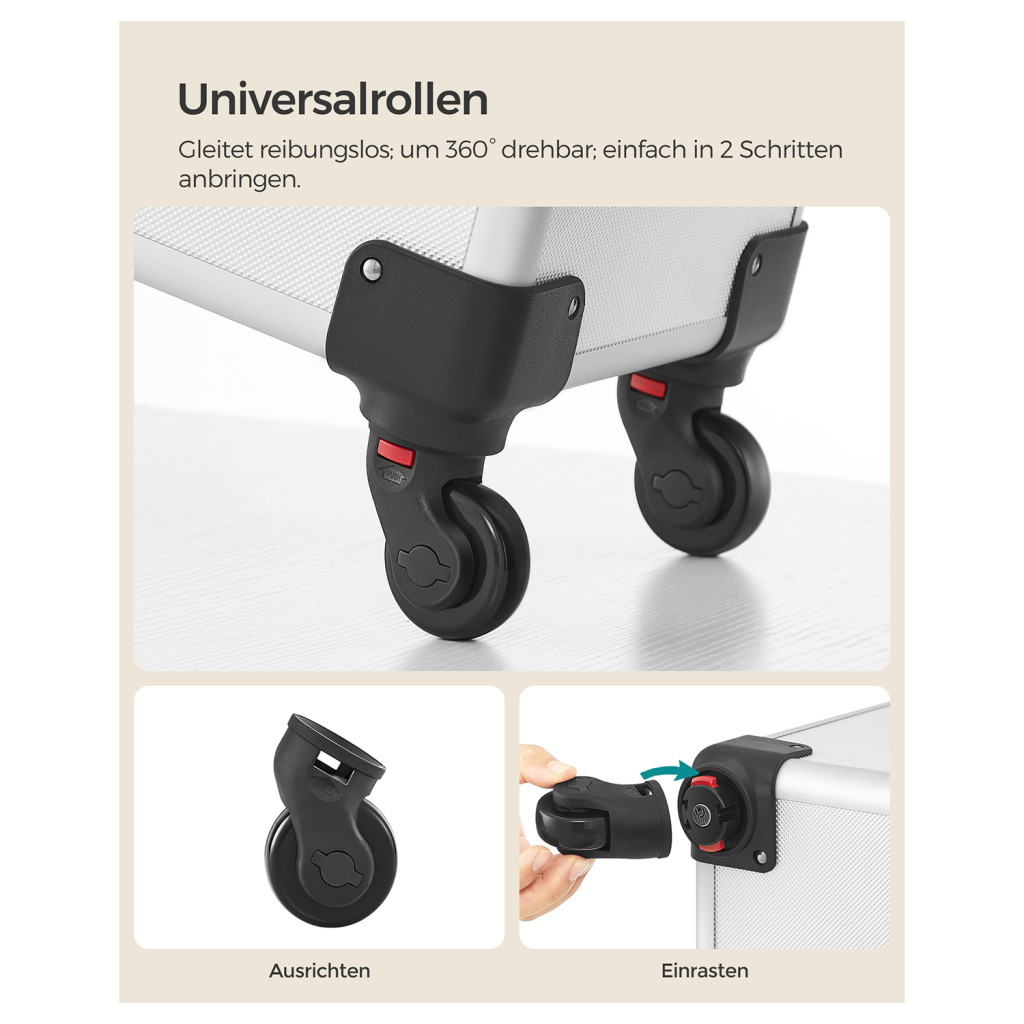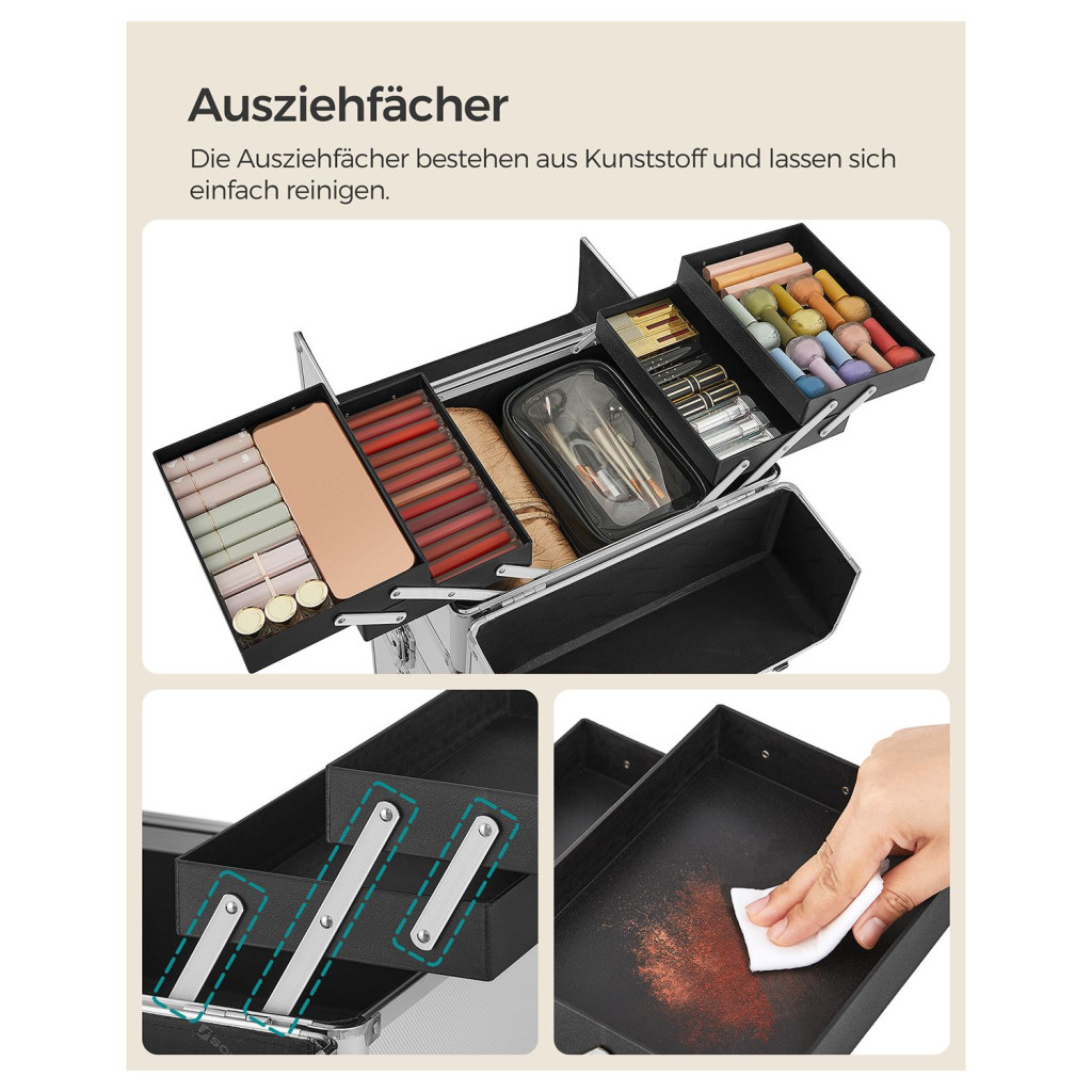 A 360°-ban forgó kerekek és a teleszkópos fogantyú könnyű mozgathatóságot biztosítanak, míg a strapabíró alumínium konstrukció maximális védelmet nyújt a tartalomnak. A zárható rekeszek biztonságban tartják az értékes kozmetikumokat, a kivehető tálcák pedig könnyen tisztíthatók.
