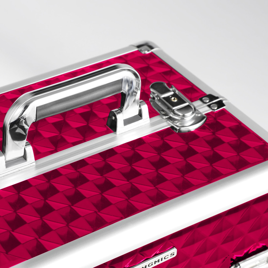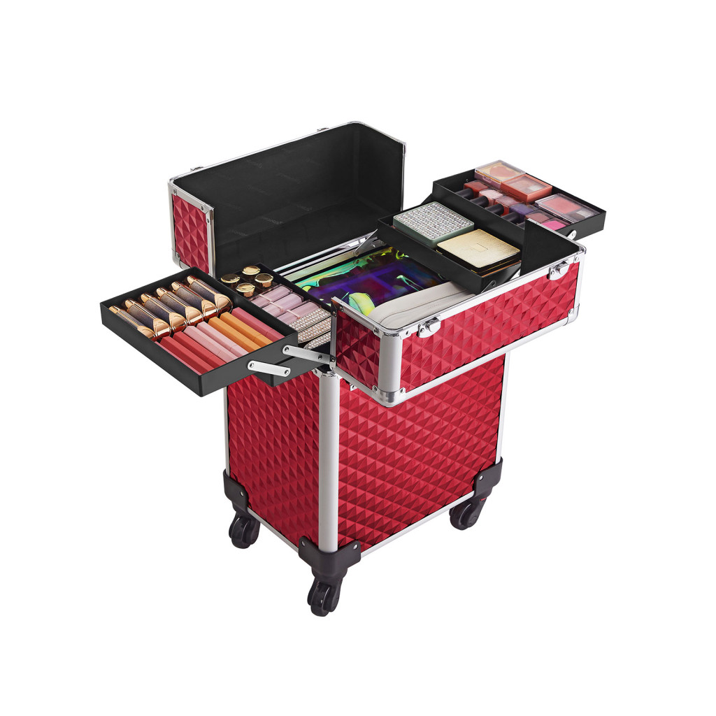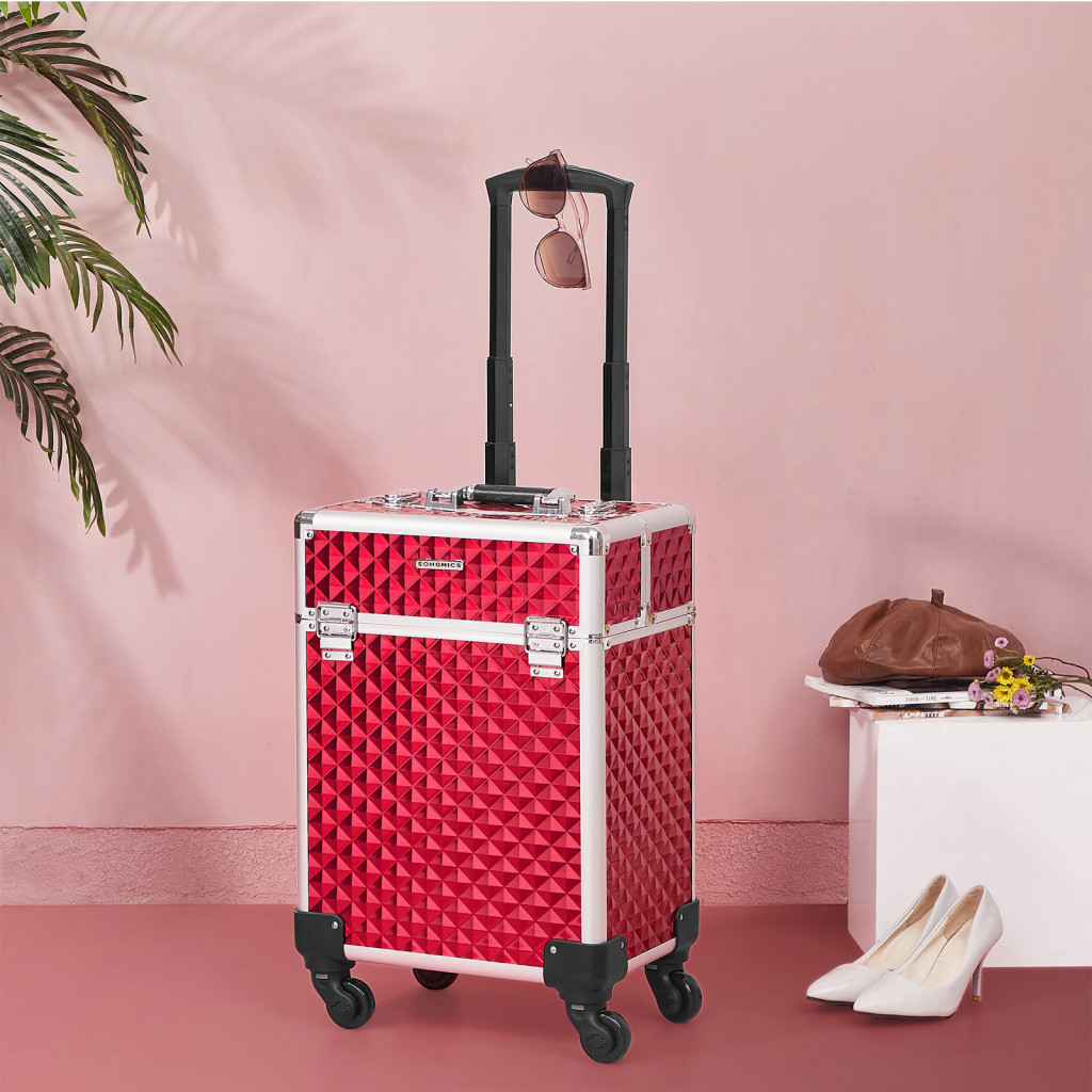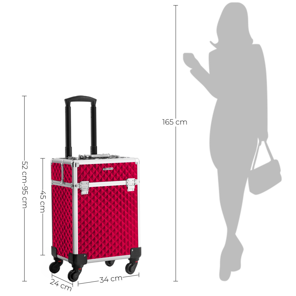 SONGMICS Professzionális Kozmetikai Bőrönd Piros Gyémántmintás Gurulós Sminktáska