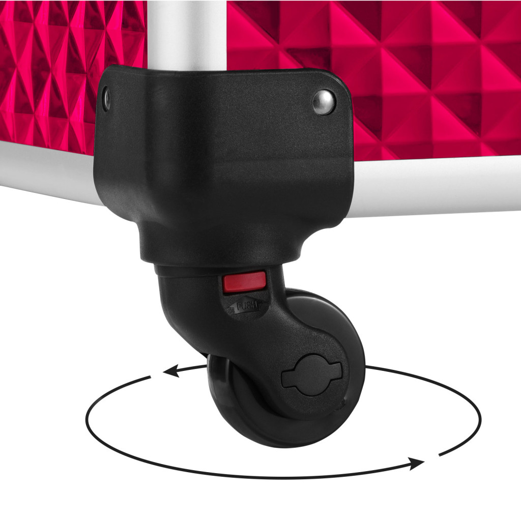 Ez a prémium minőségű kozmetikai bőrönd tökéletes megoldást nyújt a sminkeszközök rendszerezett tárolására és biztonságos szállítására. A piros gyémántmintás külső nem csak stílusos megjelenést kölcsönöz, de tartós ABS műanyag borítása védelmet is nyújt. A teleszkópos fogantyú és a 360 fokban elforduló kerekek könnyű manőverezhetőséget biztosítanak.
