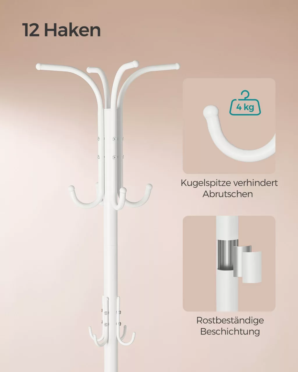 A SONGMICS szabadon álló fogas tökéletes választás azok számára, akik funkcionalitást és elegáns megjelenést keresnek otthonukba. A 175 cm magas, gyöngyfehér fém konstrukció 12 kampót kínál, amelyek mindegyike akár 4 kg terhelést is elbír, így kabátok, táskák és egyéb ruhadarabok biztonságosan tárolhatók. A négy stabil láb és az alacsony súlypont garantálja a fogas stabilitását még nehezebb terhek esetén is.