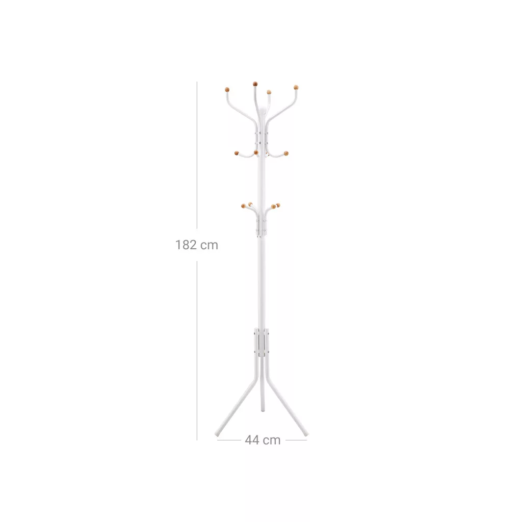 Ez az elegáns SONGMICS álló fogas 12 praktikus akasztóval rendelkezik kabátok, kalapok, táskák és kiegészítők tárolására. A stabil fém konstrukció és a krémfehér kivitel tökéletes kiegészítője bármely előtérnek vagy hálószobának.