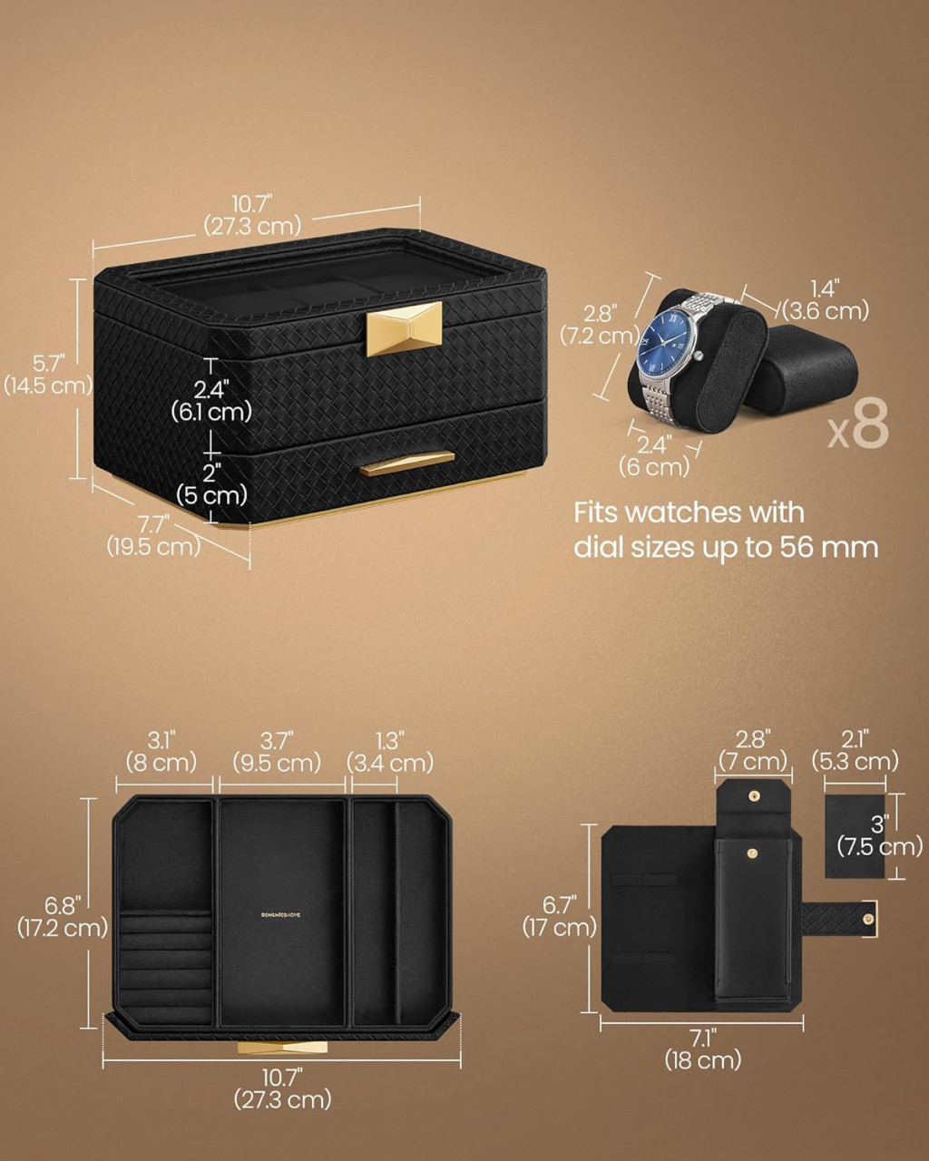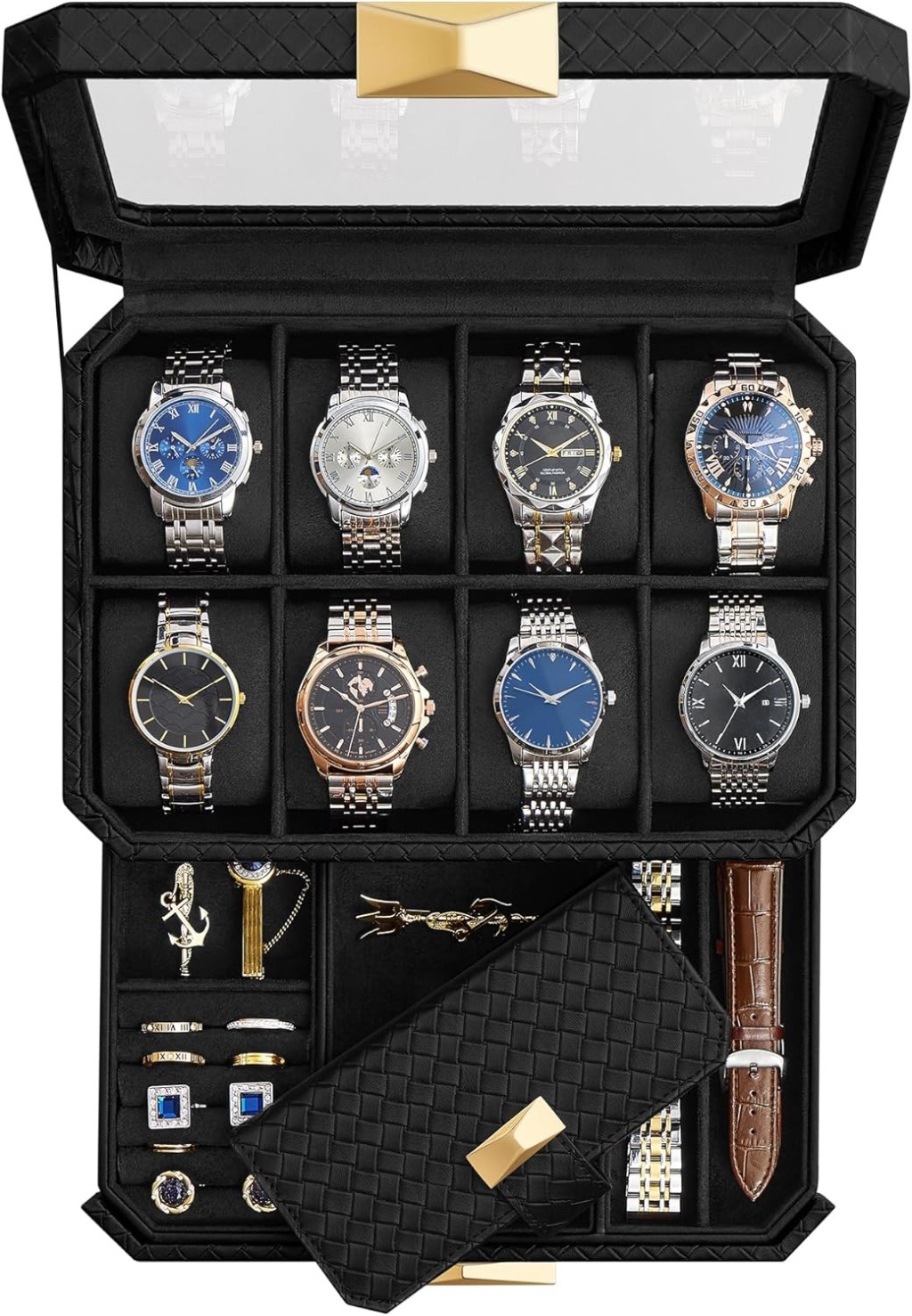 Elegáns, kétrétegű óratartó doboz 8 óra tárolására, kiegészítő fiókkal és utazótokkal. Fonott mintázatú PU bőr borítás és arany színű díszítőelemek teszik igazán különlegessé.