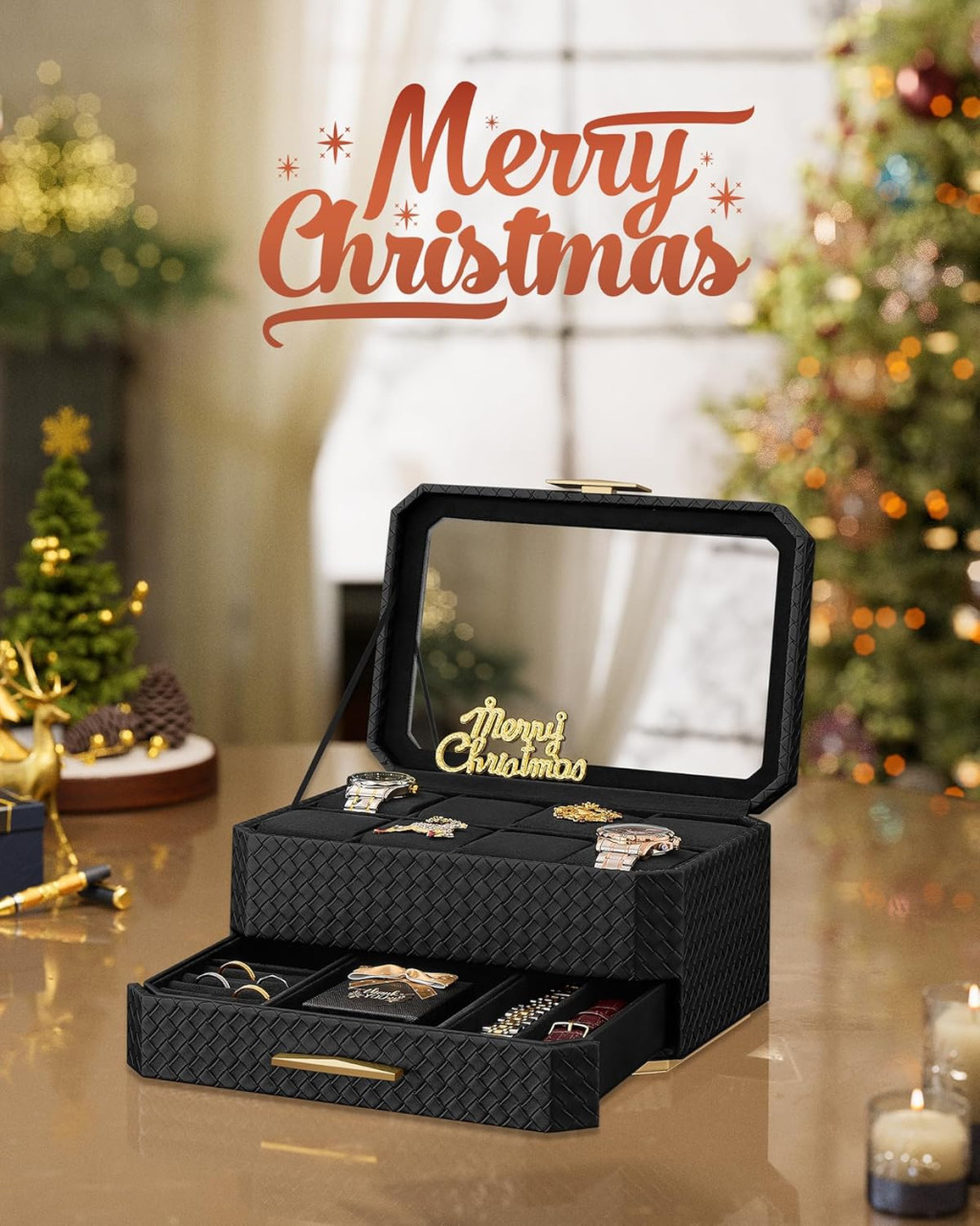 Ez a prémium kivitelű óratartó doboz tökéletes megoldást kínál értékes időmérőinek tárolására és bemutatására. A fonott mintázatú fekete PU bőr borítás és az arany színű díszítőelemek harmonikus összhangja luxus megjelenést kölcsönöz a terméknek. Az üveg fedél alatt 8 óra helyezhető el biztonságosan, míg az alsó fiók további kiegészítők tárolására szolgál.