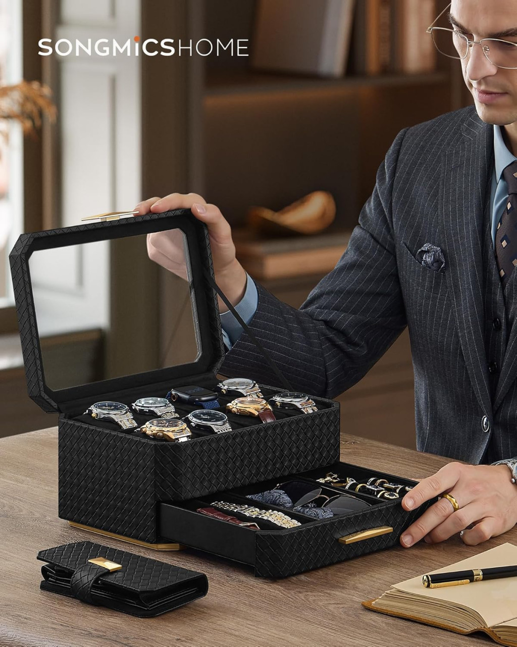 SONGMICS RONNE Prémium Óratartó Doboz 8 Órához Fiókkal Fekete PU Bőr UJWB025B01