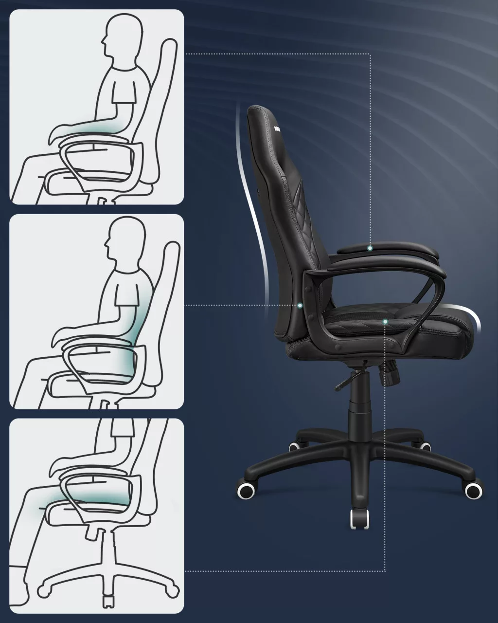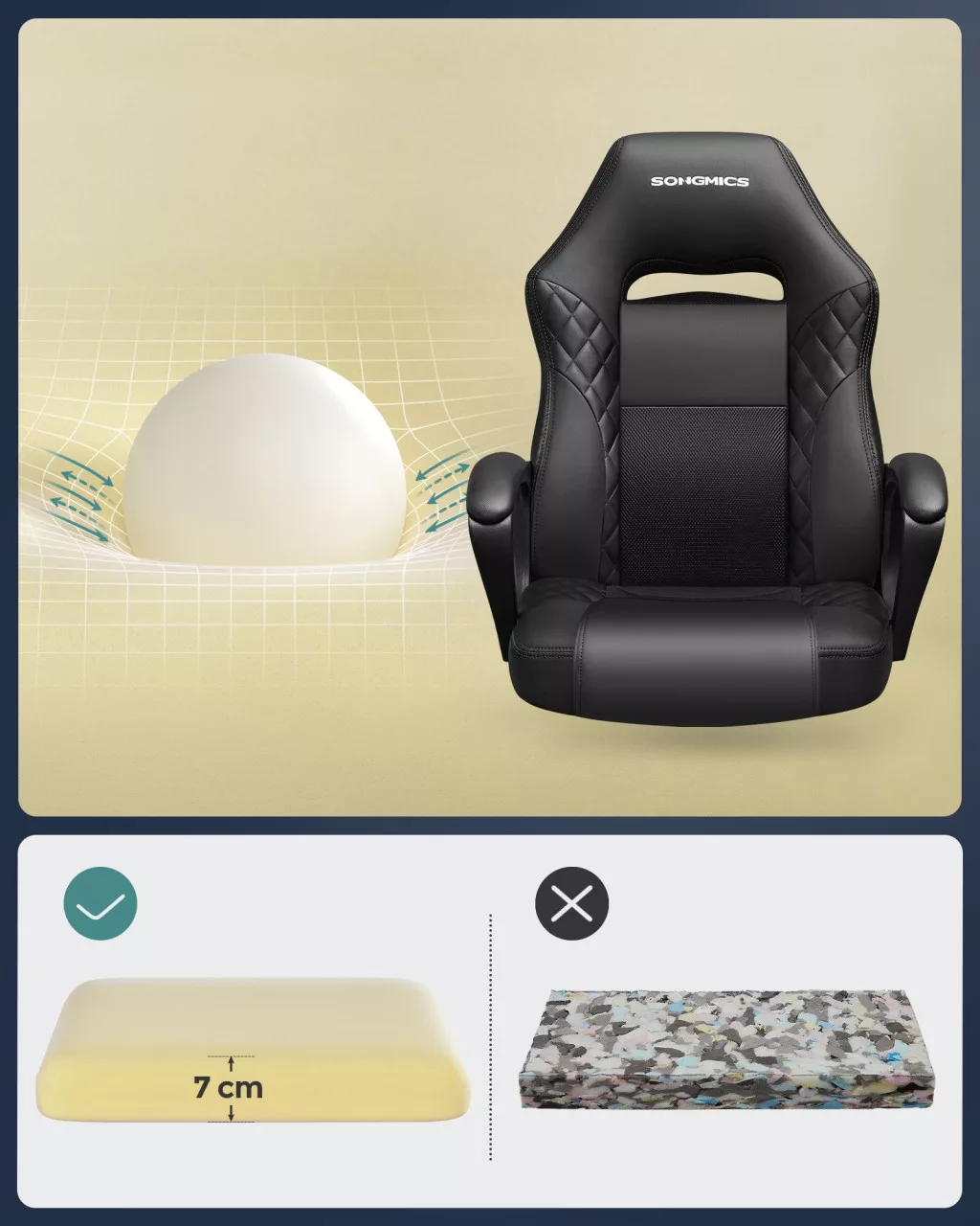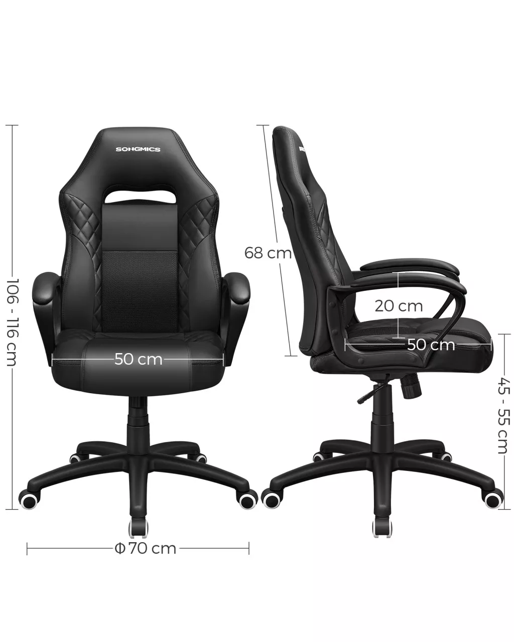 A SONGMICS Racing Sport gamer szék egyesíti a stílust és a funkcionalitást. Az S-alakú háttámla tökéletes támaszt nyújt a gerincnek, míg a légáteresztő hálós elemekkel kombinált PU bőr borítás kellemes hőszabályozást biztosít hosszú használat során is.