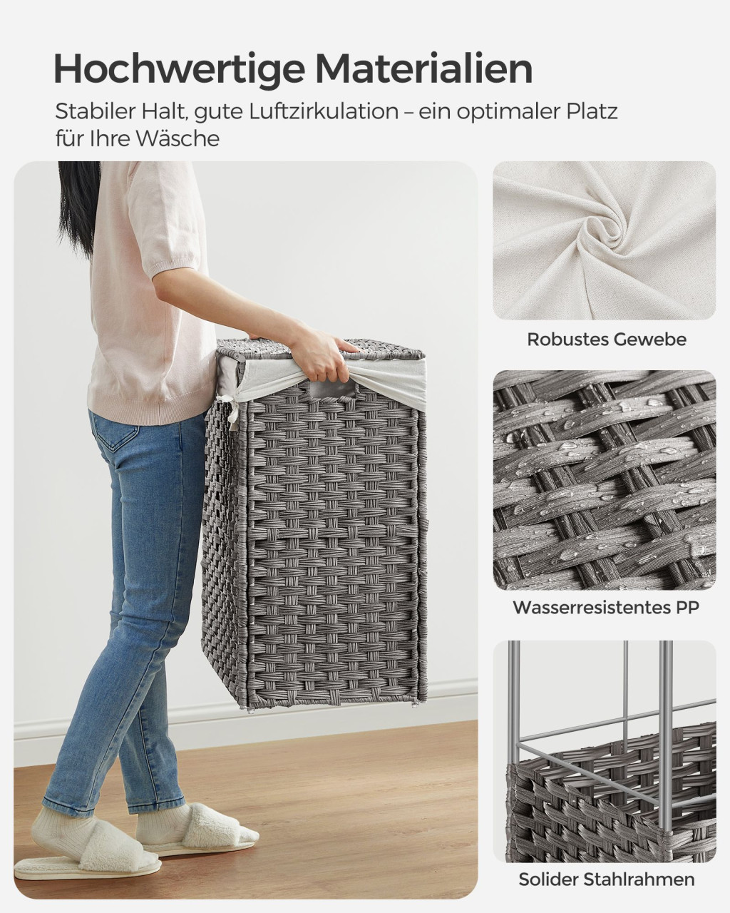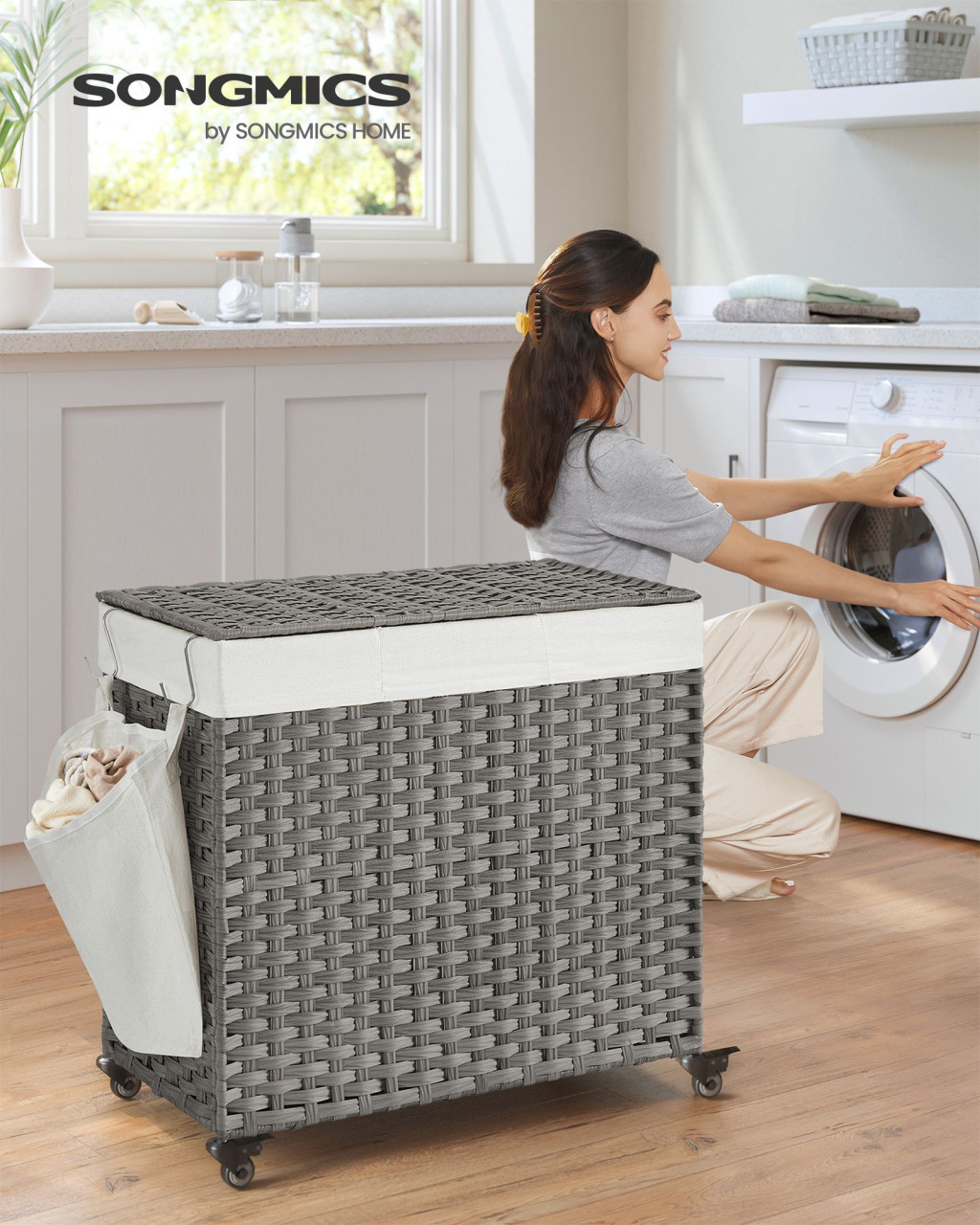 Nagy kapacitású, 140 literes szennyestartó kosár három rekesszel, amely segít a ruhák színek szerinti szétválogatásában. Stílusos rattan hatású kivitel fedéllel és kerekekkel a könnyű mozgathatóságért.