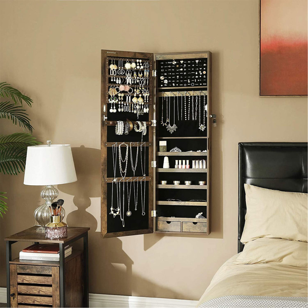 SONGMICS Rusztikus Barna Ékszertároló Szekrény Tükörrel
