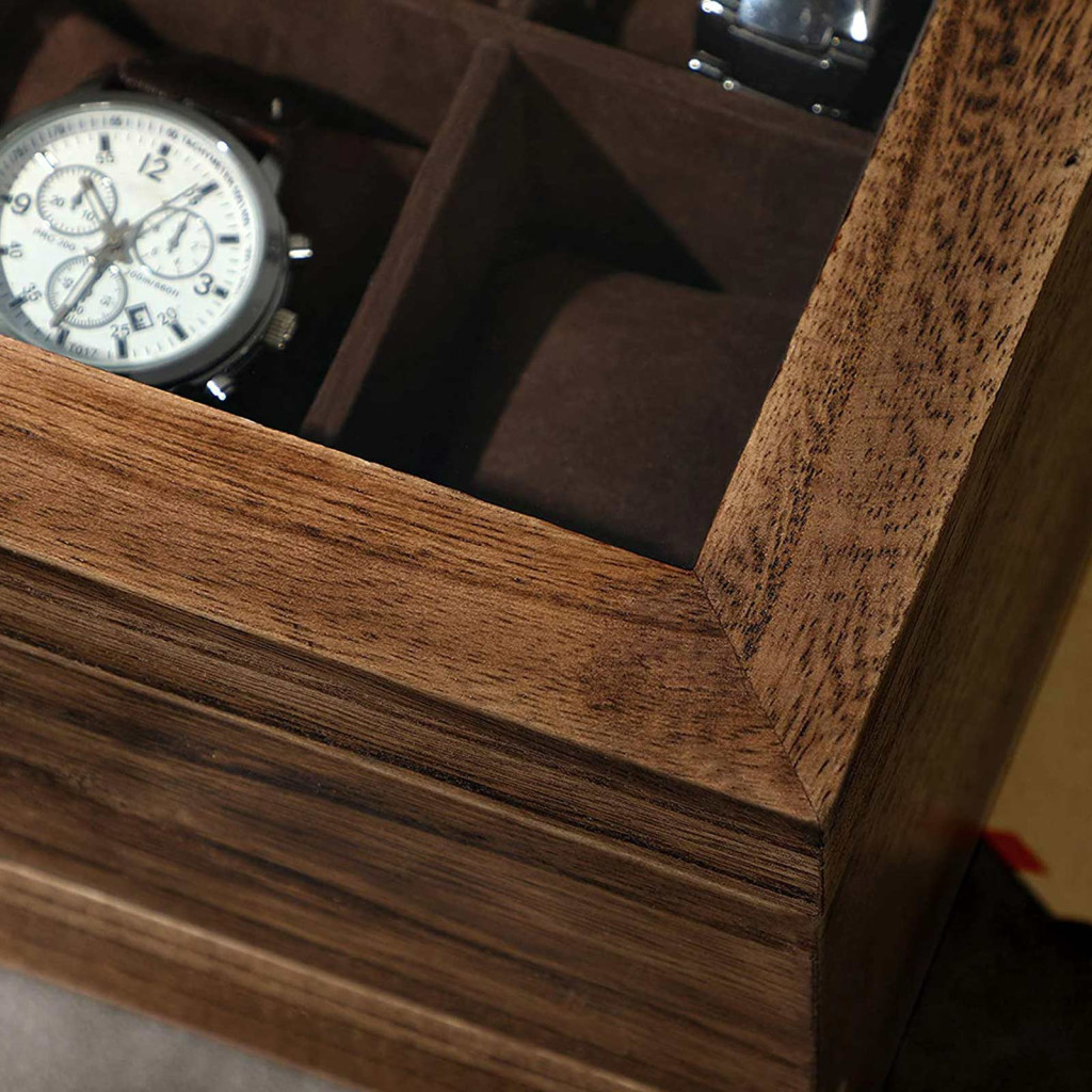 Ez a kézműves óratartó doboz tökéletes megoldást nyújt értékes óragyűjteménye tárolására és bemutatására. A paulownia fából készült, rusztikus dió színű doboz nyolc órát képes befogadni a felső szinten, míg az alsó fiók további tárolóhelyet biztosít kiegészítők számára.