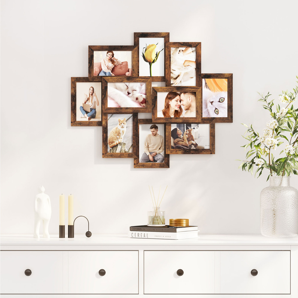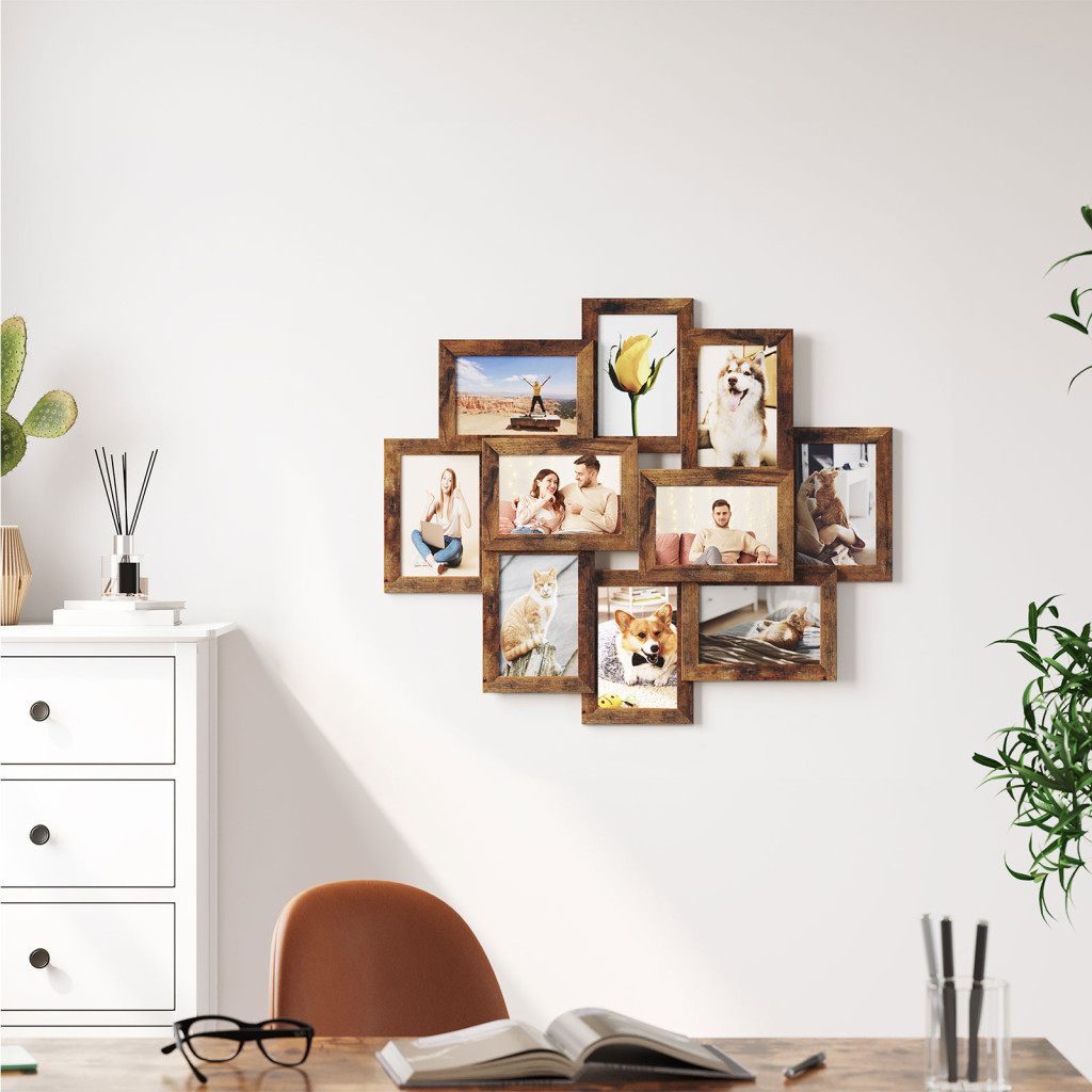 Elegáns, rusztikus barna képkeret kollázs 10 db 10x15 cm-es fénykép megjelenítéséhez, amely tökéletes módja kedvenc emlékei stílusos bemutatásának.