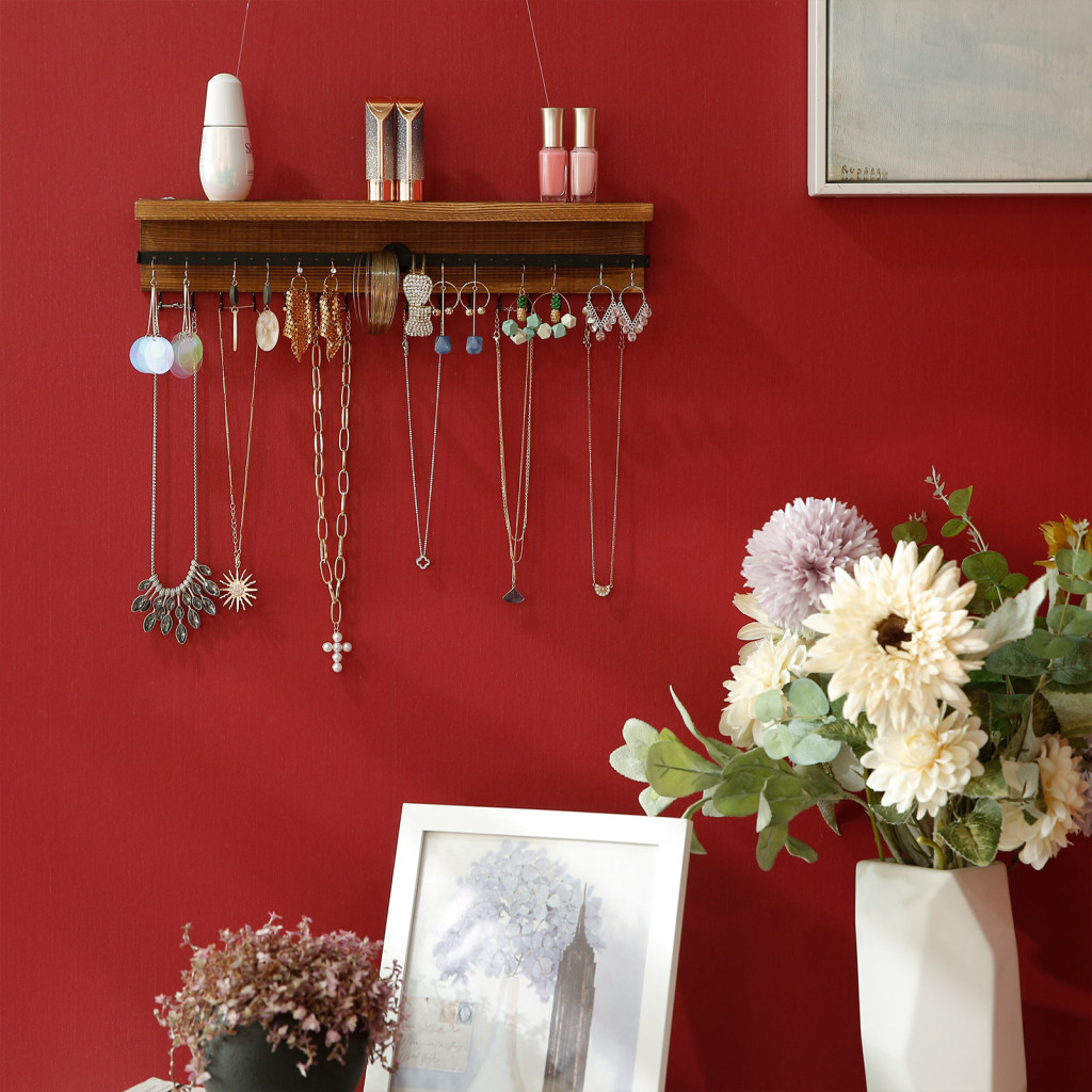 Ez a rusztikus barna fenyőfából készült fali ékszertartó tökéletes kombinációja a funkcionalitásnak és a stílusnak. A felső polc ideális parfümök és kisebb tárgyak tárolására, míg az ipari stílusú fekete fémrúdon 16 akasztó és 26 furat biztosítja nyakláncai, karkötői és fülbevalói rendezett elhelyezését.
