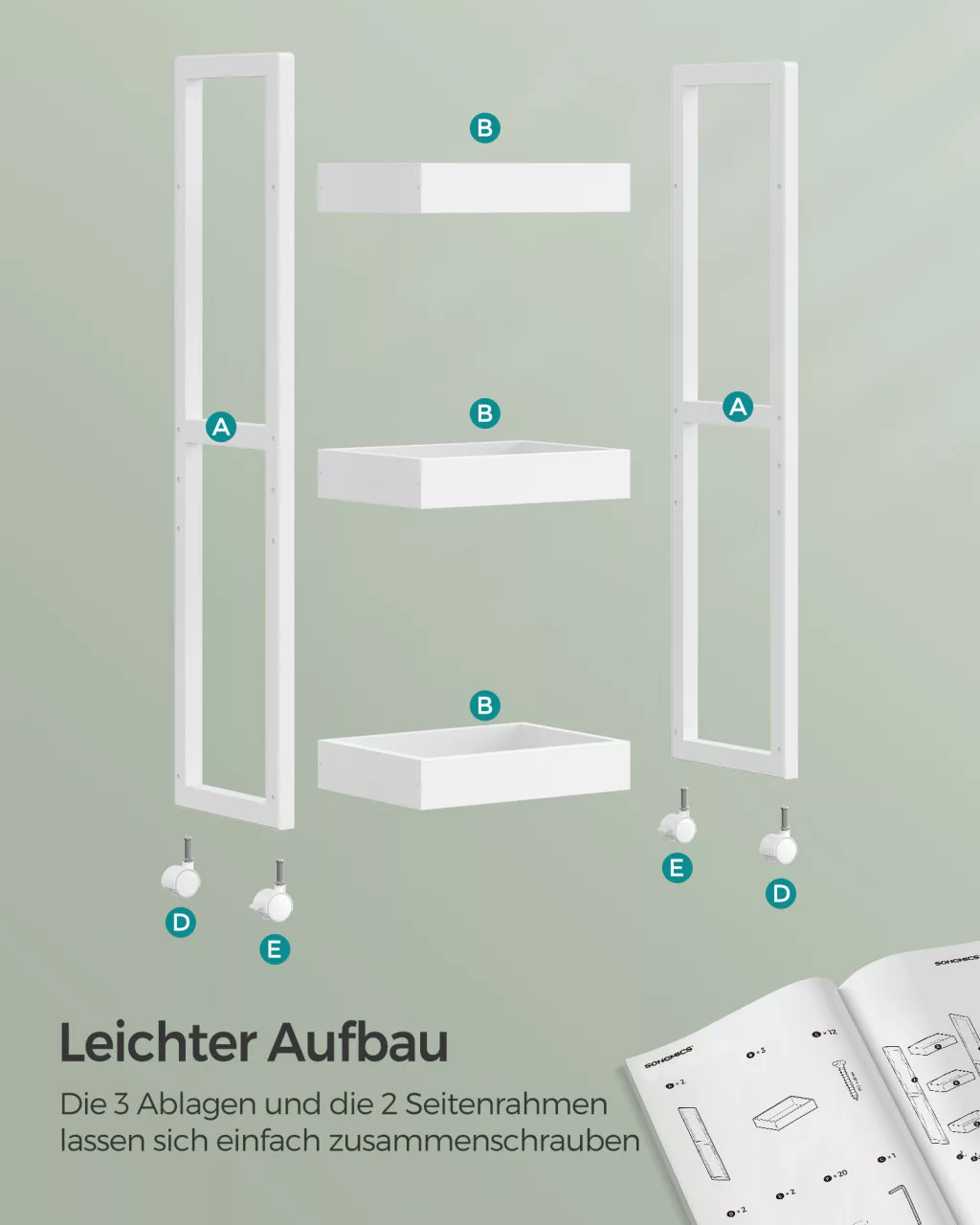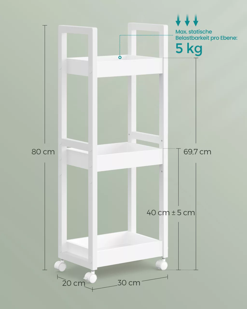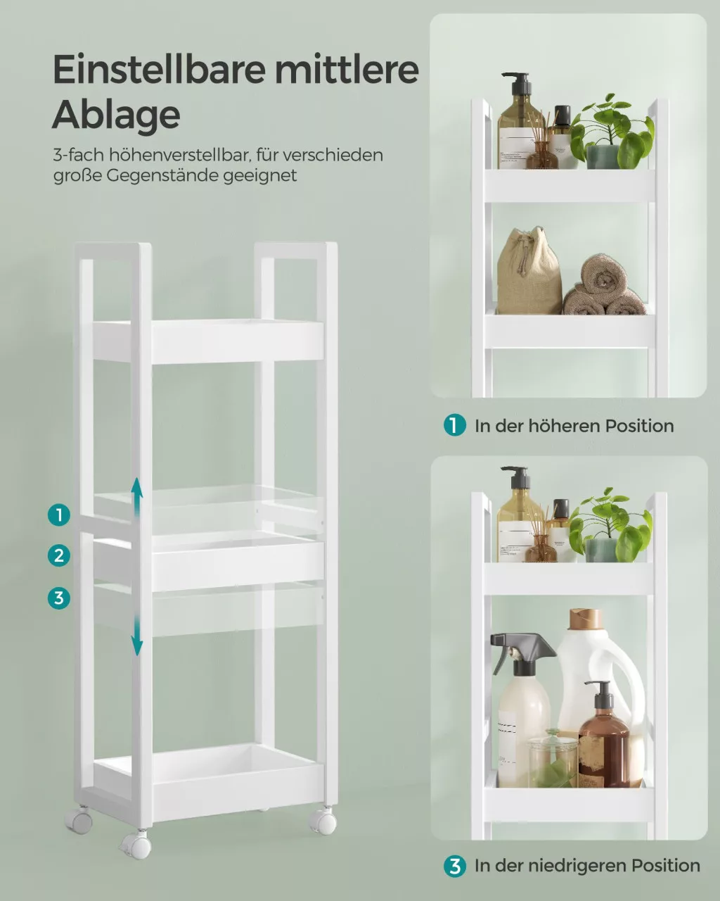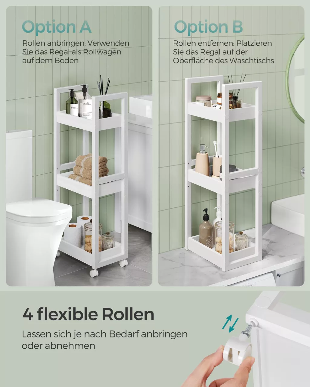Kompakt, sokoldalú tárolómegoldás görgőkkel vagy anélkül, ideális fürdőszobákba és kis terekbe. Állítható polcmagassággal és 5 kg-os polconkénti terhelhetőséggel.