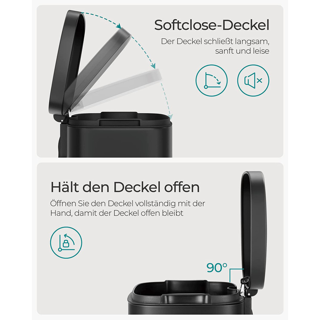 Ez a SONGMICS pedálos szemetes ötvözi a stílusos megjelenést a praktikus funkcionalitással. A minőségi acélból készült, fekete kivitelezésű hulladékgyűjtő tökéletesen illeszkedik bármilyen modern konyhai környezetbe. A puha záródású fedél mechanizmus biztosítja a halk és kényelmes használatot.