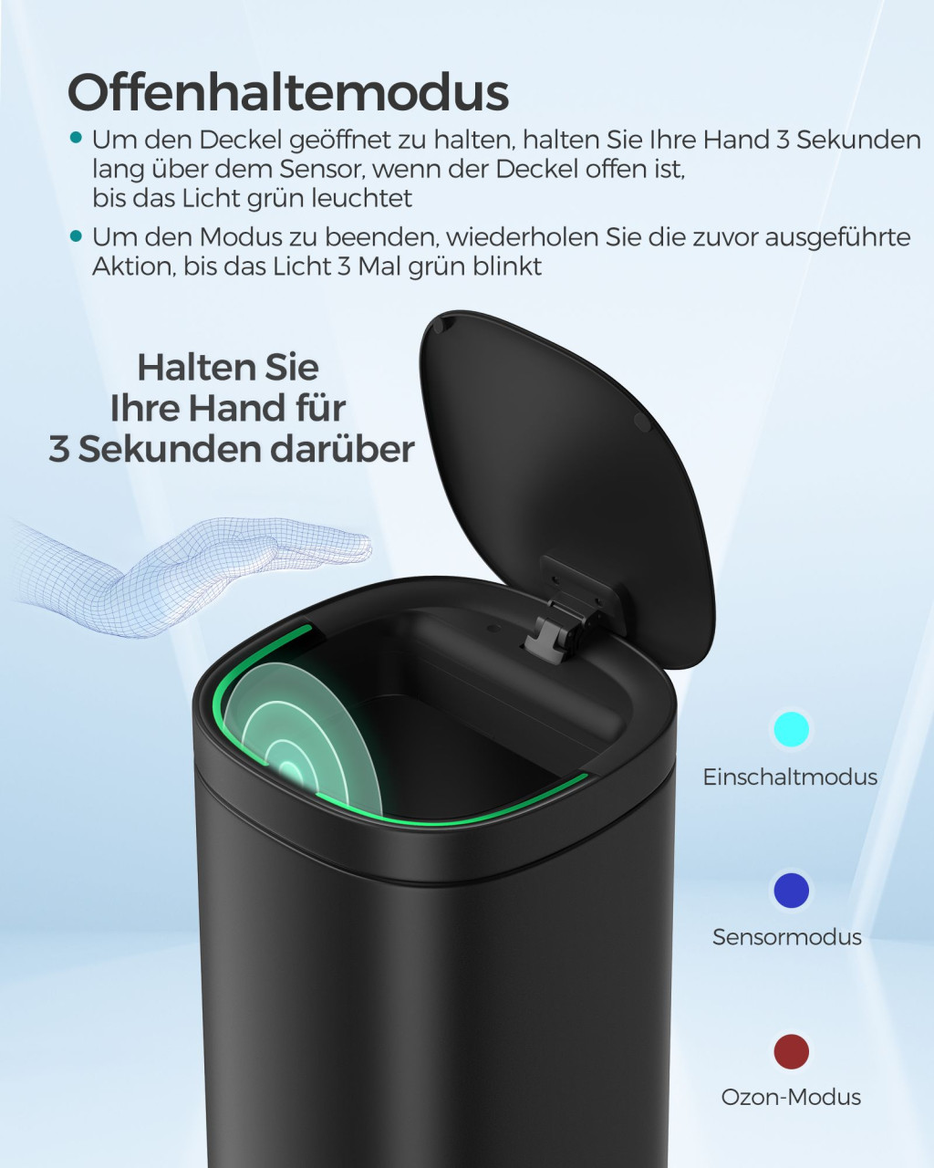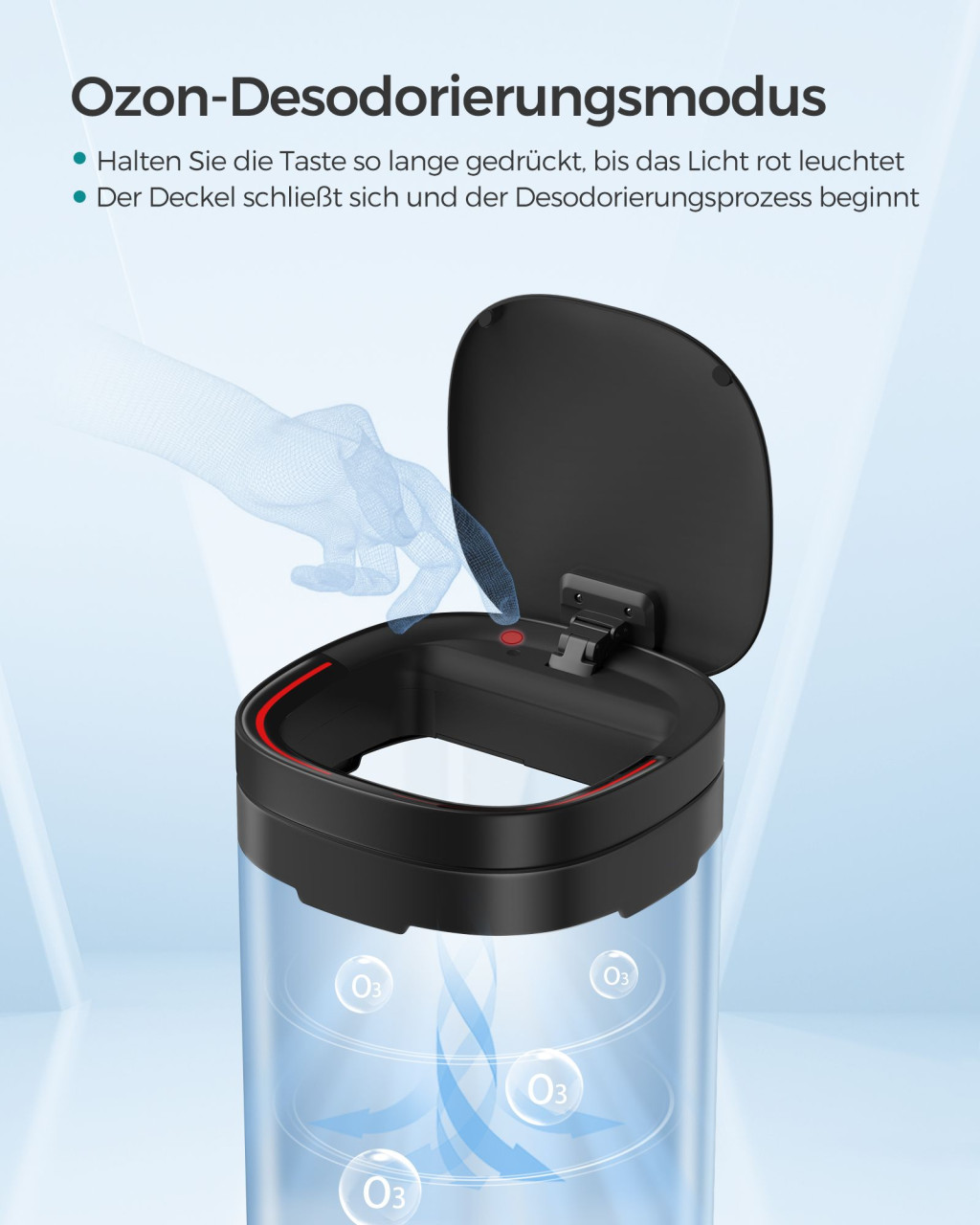 Modern, szenzoros konyhai szemetes beépített ózon szagtalanítóval és többszínű visszajelző fényekkel, amely tökéletes megoldást nyújt a modern konyhákba.