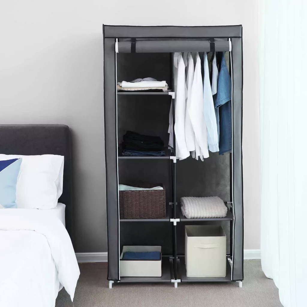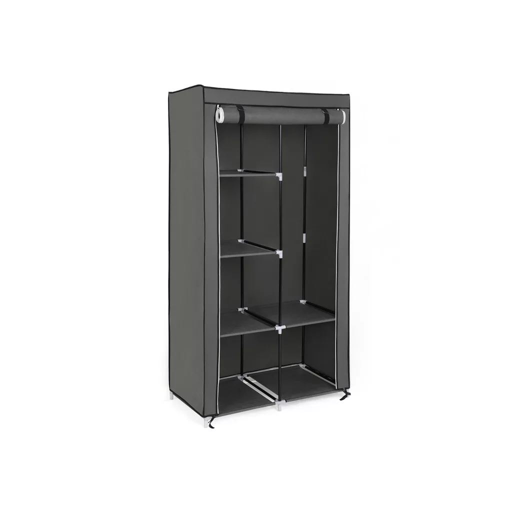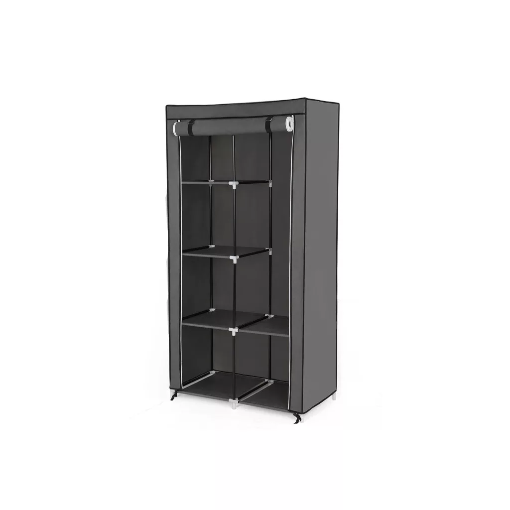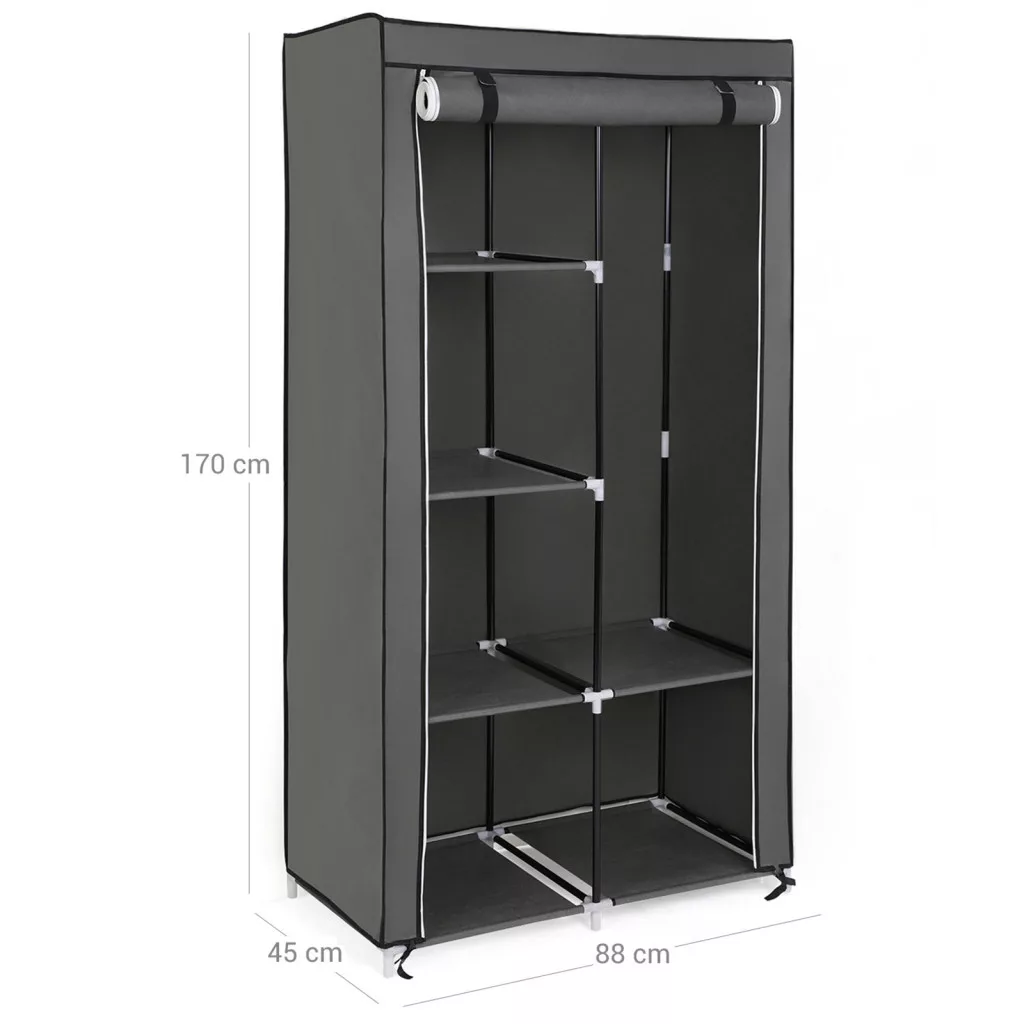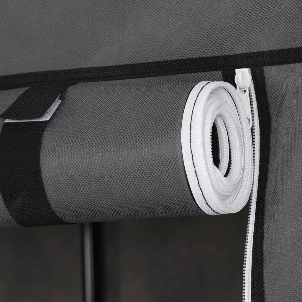 A vízlepergető és porálló szürke textil borítás megvédi ruháit a külső hatásoktól, míg a stabil fémvázas szerkezet tartós használatot biztosít. A cipzáras ajtó könnyű hozzáférést biztosít, ugyanakkor védelmet nyújt a por ellen.