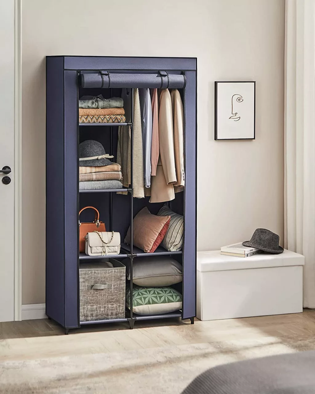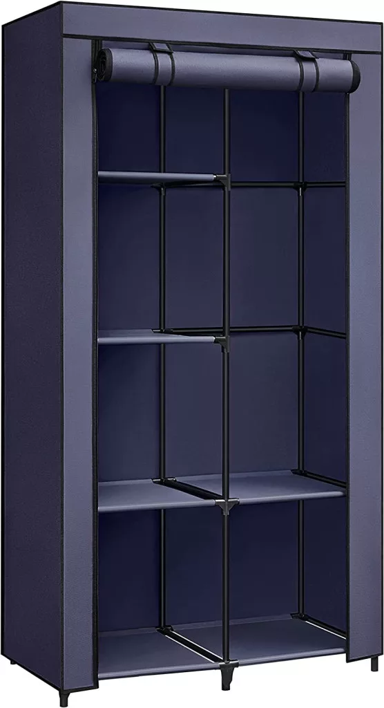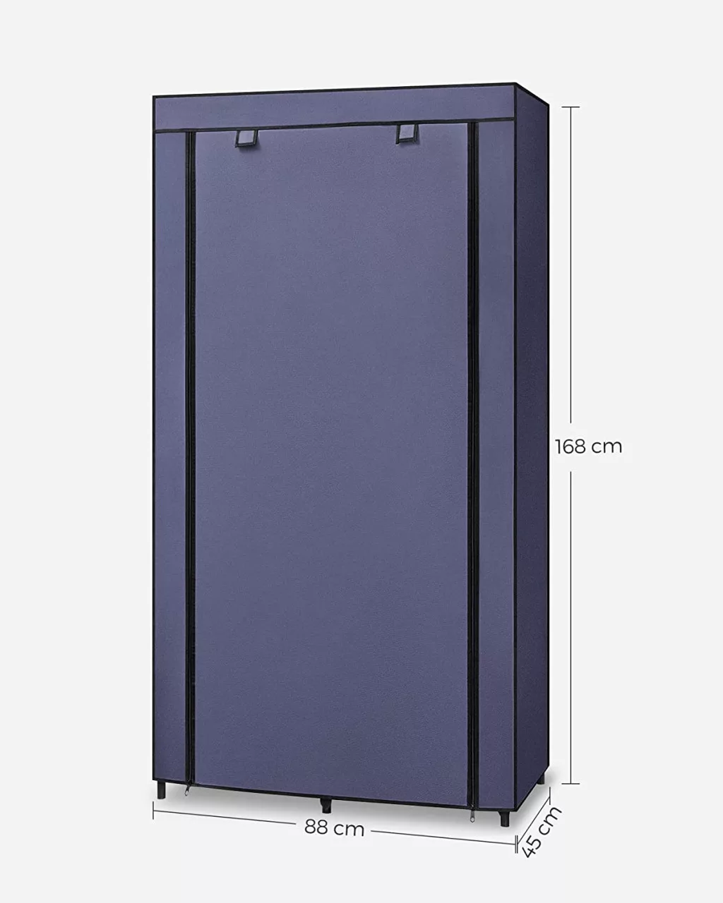 Ez a modern textil ruhásszekrény egyesíti a praktikumot és az esztétikumot. A sötétkék nemszőtt anyagból készült borítás nem csak védi a ruhákat a portól, de elegáns megjelenést is kölcsönöz a bútornak. A stabil fémvázszerkezet és a megerősített műanyag csatlakozók hosszú élettartamot biztosítanak.