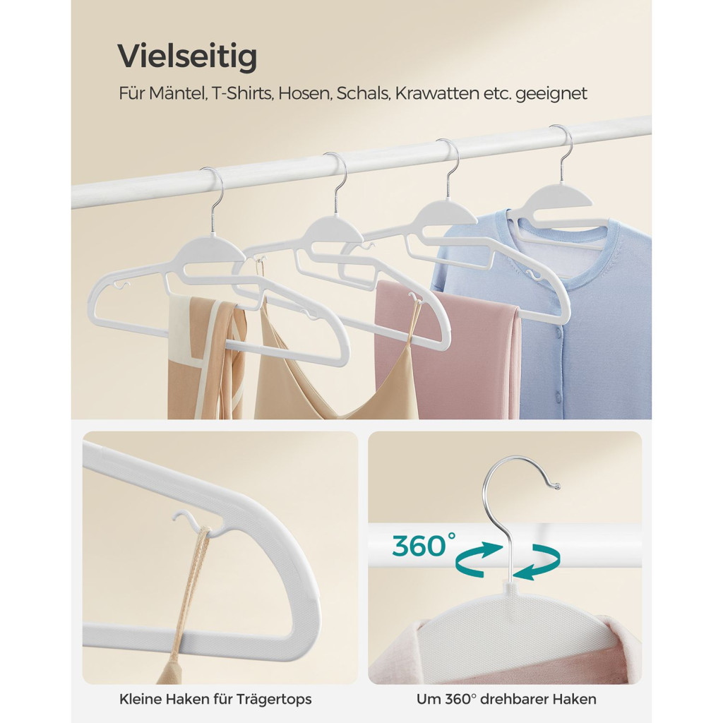 A 360°-ban forgatható fémakasztó és az oldalsó kampók extra funkcionalitást biztosítanak. A tartós ABS műanyagból készült vállfák egyenként 5 kg terhelést bírnak el, így kabátok és nadrágok tárolására is kiválóan alkalmasak.