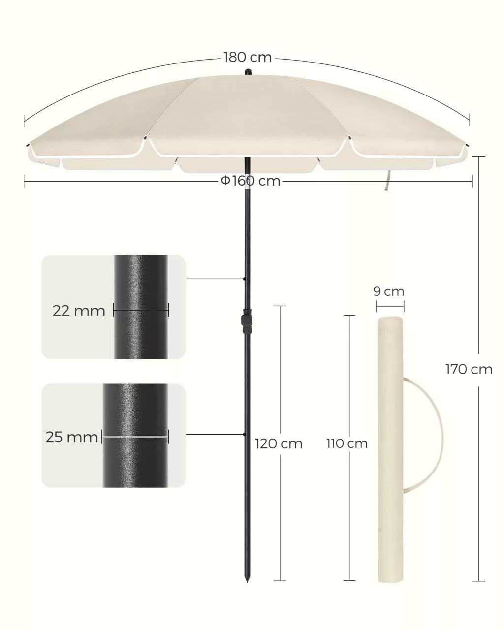 Kiváló UV-védelemmel ellátott, 1,6 méteres, hordozható napernyő döntési mechanizmussal és praktikus hordtáskával, tökéletes választás strandra, kertbe vagy medence mellé.