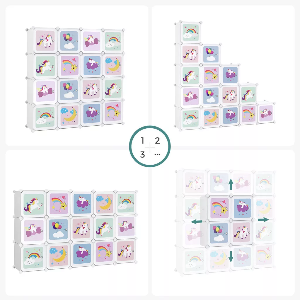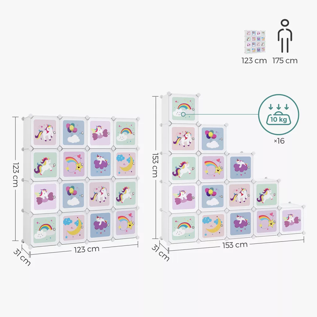 Ez a bájos, unikornisos és szivárványos mintázatú tárolószekrény nem csupán praktikus bútor, hanem a gyerekszoba dísze is egyben. A 16 egyedi mintával ellátott rekesz mindegyike 30x30 cm-es, így tökéletes játékok, könyvek és ruhák tárolására.
