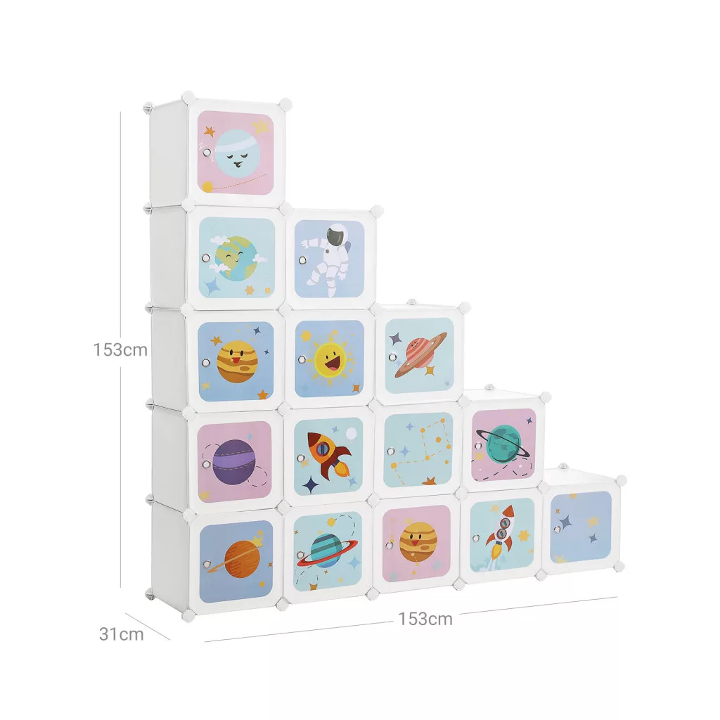 Ez a szemet gyönyörködtető tárolószekrény űrhajós, bolygó és rakéta motívumokkal díszített ajtópanelekkel rendelkezik, amelyek azonnal felkeltik a gyerekek érdeklődését. A 15 egyedi rekesz rugalmas tárolási lehetőséget biztosít játékok, ruhák és iskolai felszerelések számára.
