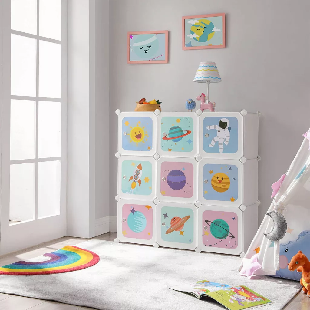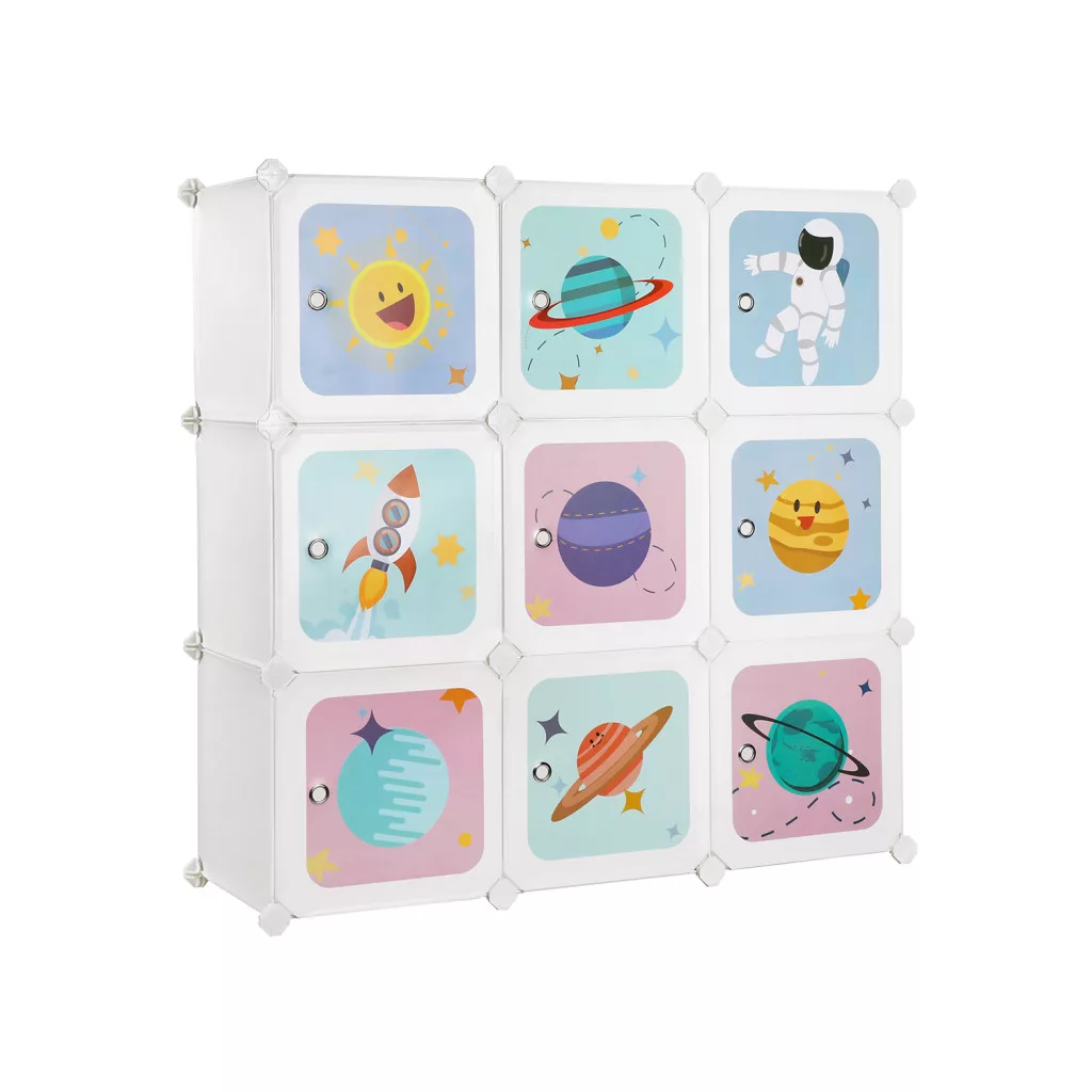 Ez a vidám, űrhajós motívumokkal díszített tárolószekrény tökéletes megoldást nyújt a gyerekszoba rendben tartására. A 10 egyforma méretű, 30x30 cm-es rekesz mindegyike egyedi bolygós, rakétás vagy űrhajós mintával van ellátva, ami nemcsak praktikus tárolóhelyet biztosít, de dekoratív eleme is a gyerekszobának.