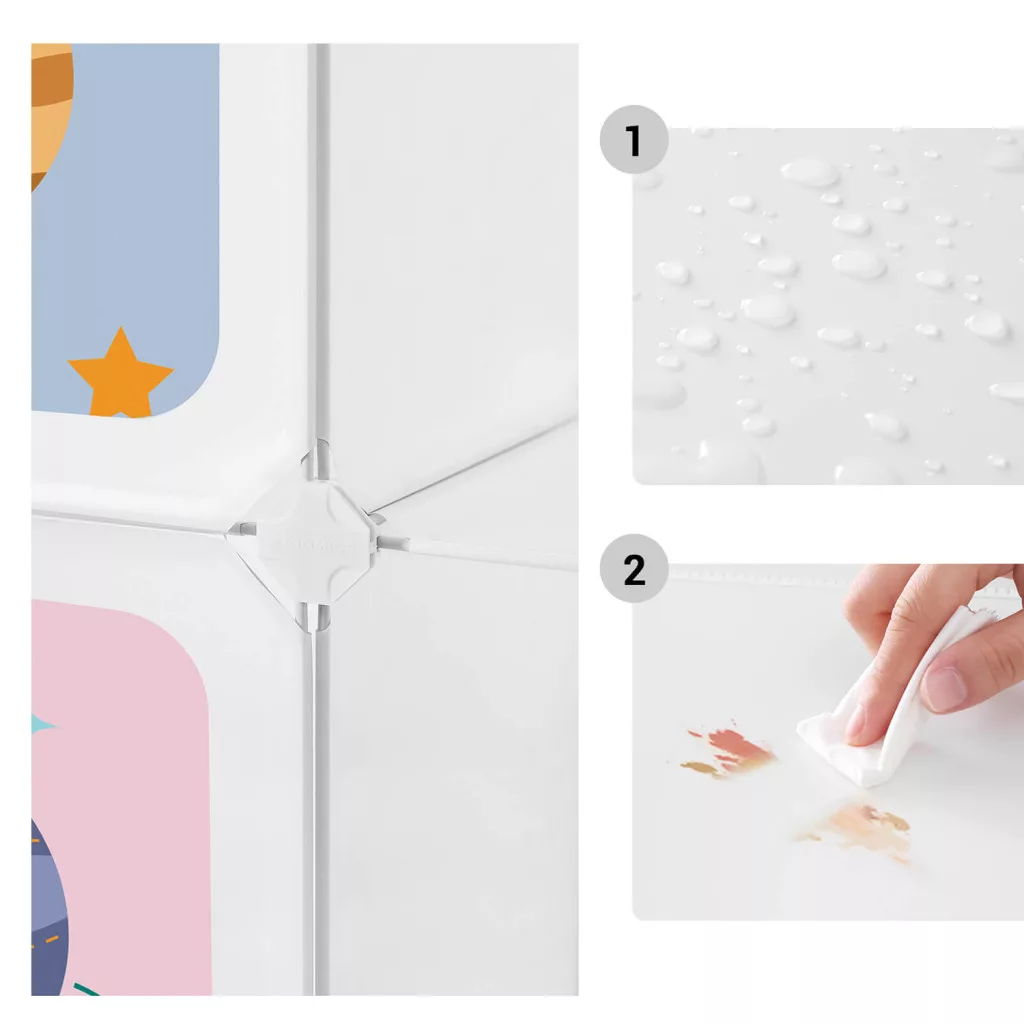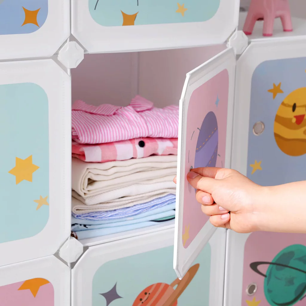 Játékos űrhajós mintázatú, biztonságos műanyag tárolórendszer 10 külön nyitható rekesszel, ideális gyerekszobába játékok, ruhák és könyvek rendszerezéséhez.
