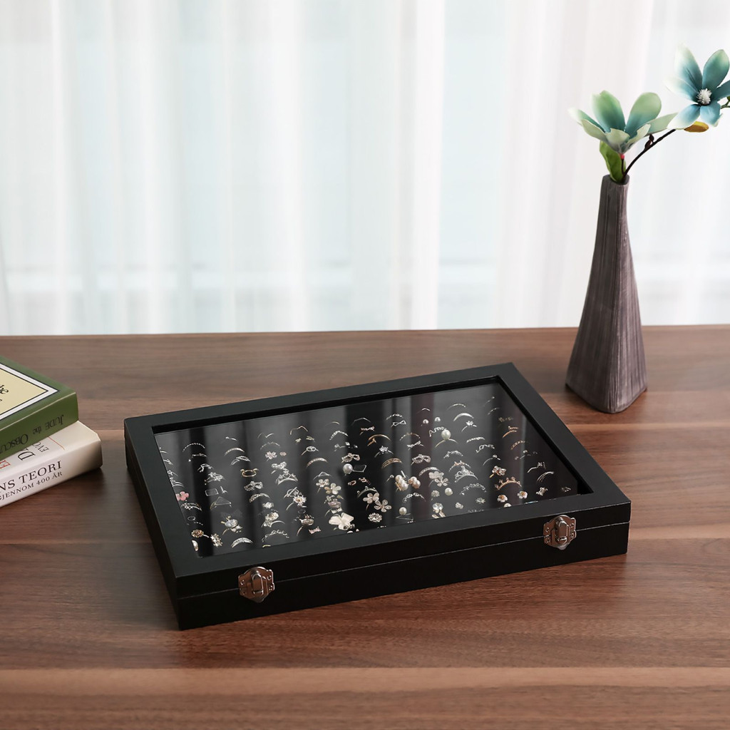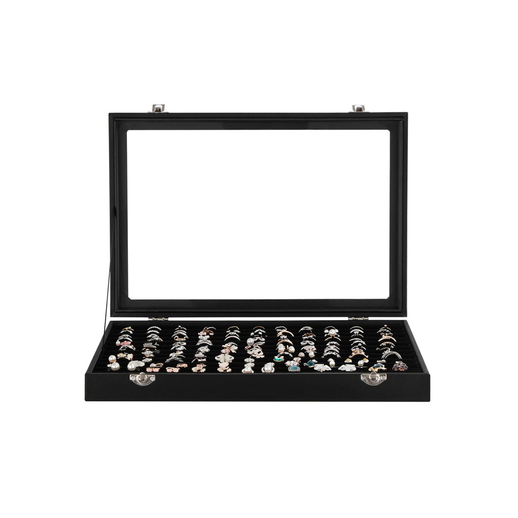 Elegáns, 100 gyűrű tárolására alkalmas üvegfedeles ékszerdoboz, amely tökéletes megoldást nyújt gyűrűk és mandzsettagombok rendszerezett tárolására és kiállítására.