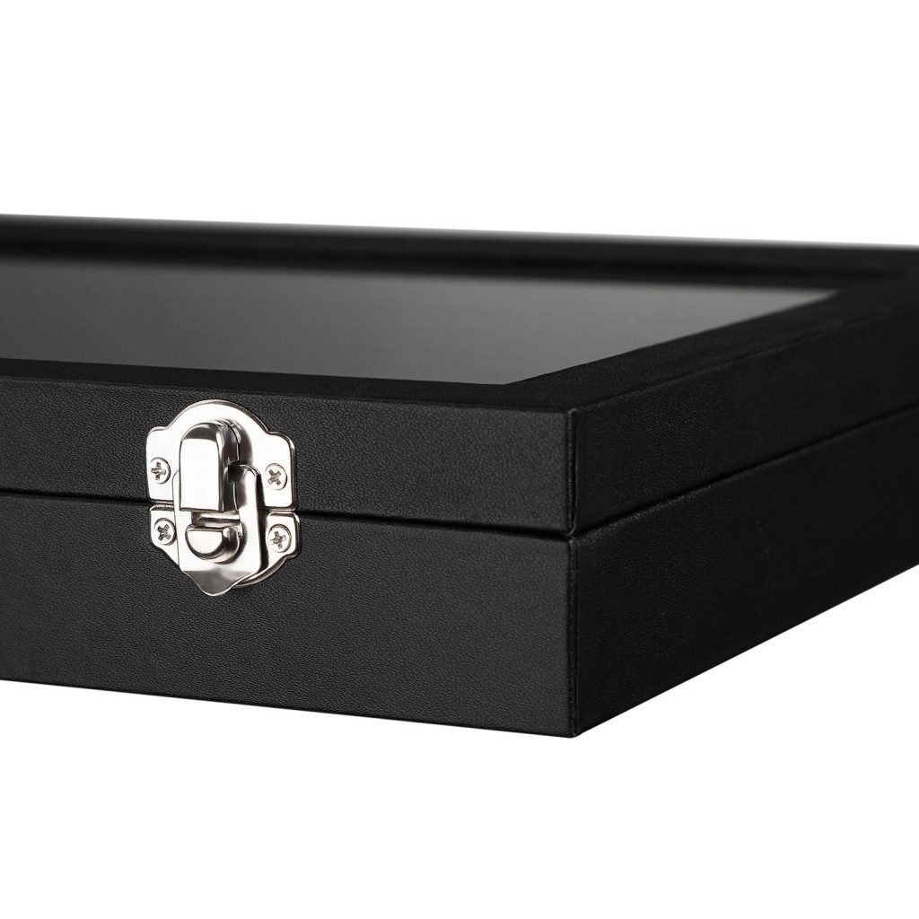 Ez a prémium minőségű gyűrűtartó doboz egyesíti a funkcionalitást és az eleganciát. A valódi üveg fedél alatt 11 bársonyozott görgő található, amelyek biztonságosan és áttekinthetően tárolják akár 100 különböző méretű gyűrűjét. A fekete műbőr borítás és a fém zárókapcsok időtlen dizájnt kölcsönöznek a doboznak.