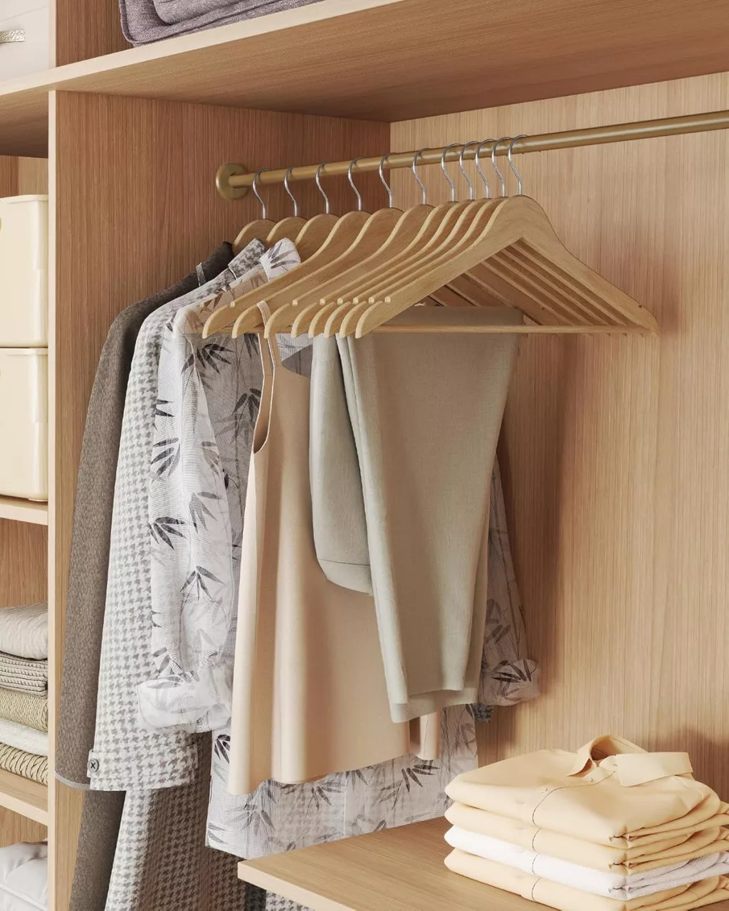 Prémium minőségű, vékony nyírfa vállfa szett 360°-ban forgó akasztóval és válltartó bevágásokkal, amely tökéletes megoldást nyújt ruhái szakszerű tárolásához.