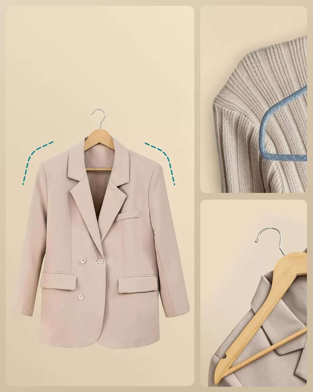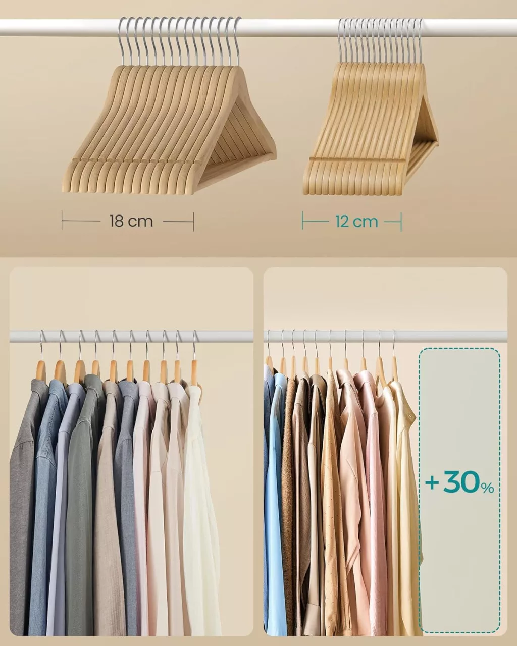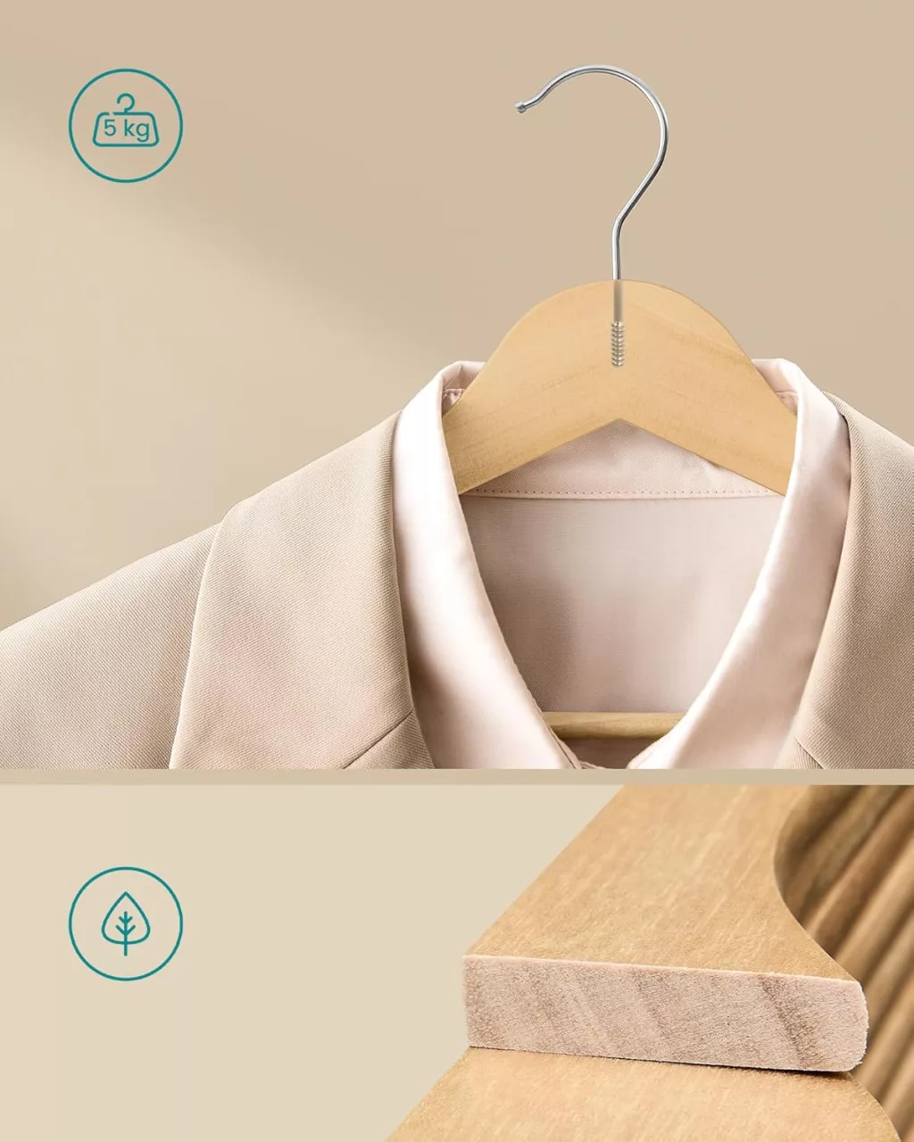 A SONGMICS nyírfa vállfa szett egyesíti a funkcionalitást és az elegáns megjelenést. A mindössze 0,8 cm vékony kialakítás 30%-kal több helyet takarít meg a szekrényben, miközben a kiváló minőségű nyírfa és acél konstrukció akár 5 kg terhelést is elbír vállfánként.