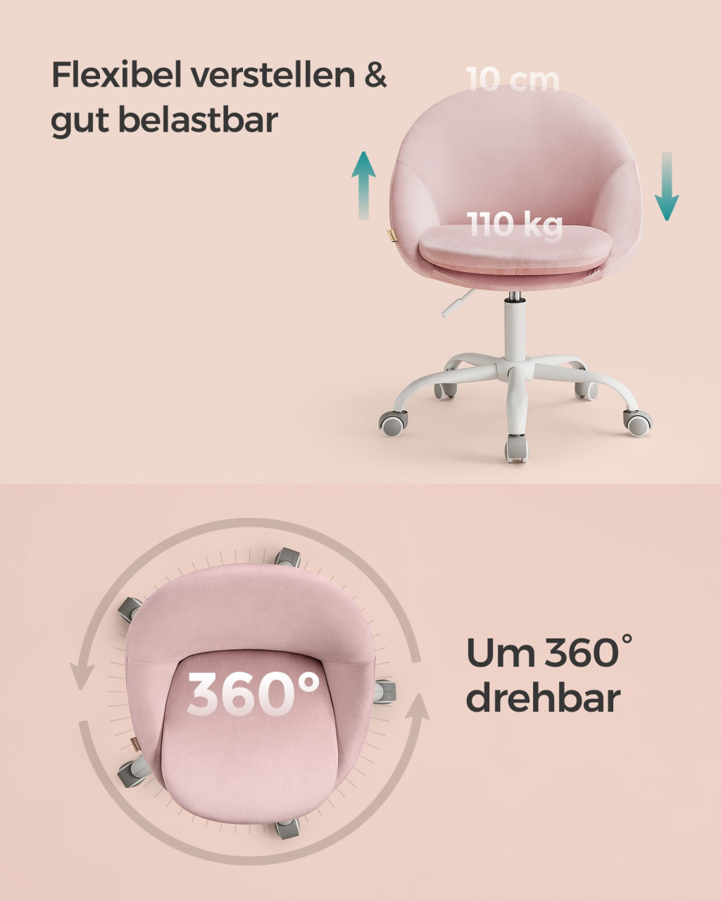 Ez a púderrózsaszín bársony forgószék tökéletesen ötvözi a stílust és funkcionalitást. A kompakt kialakítás és a 360 fokos forgás lehetővé teszi a maximális mozgásszabadságot, miközben a dupla párnázás és az ergonomikus kialakítás hosszan tartó kényelmet biztosít.