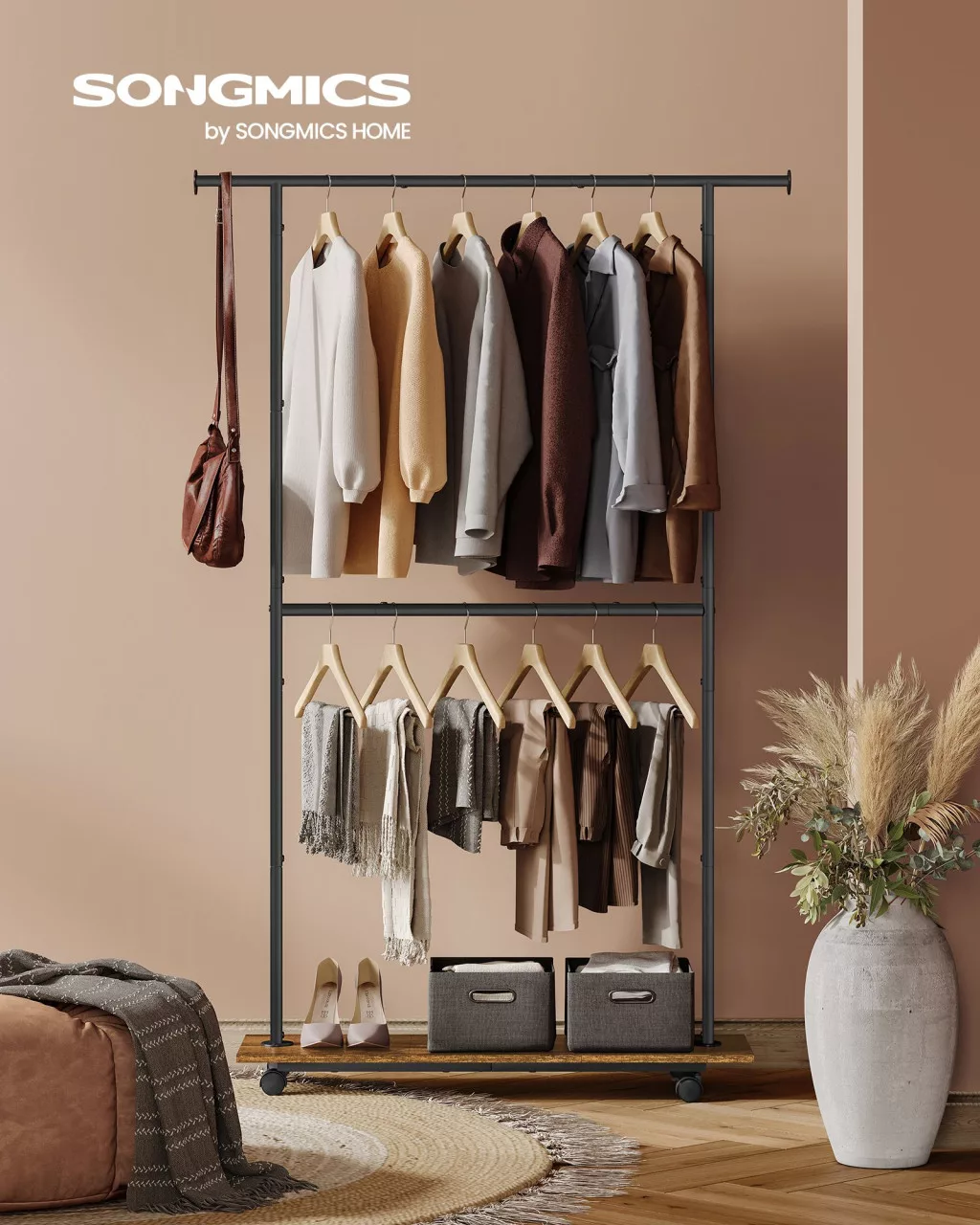 SONGMICS Vintage Ruhaállvány Dupla Rúddal és Polccal Acél Váz Vintage Barna/Fekete