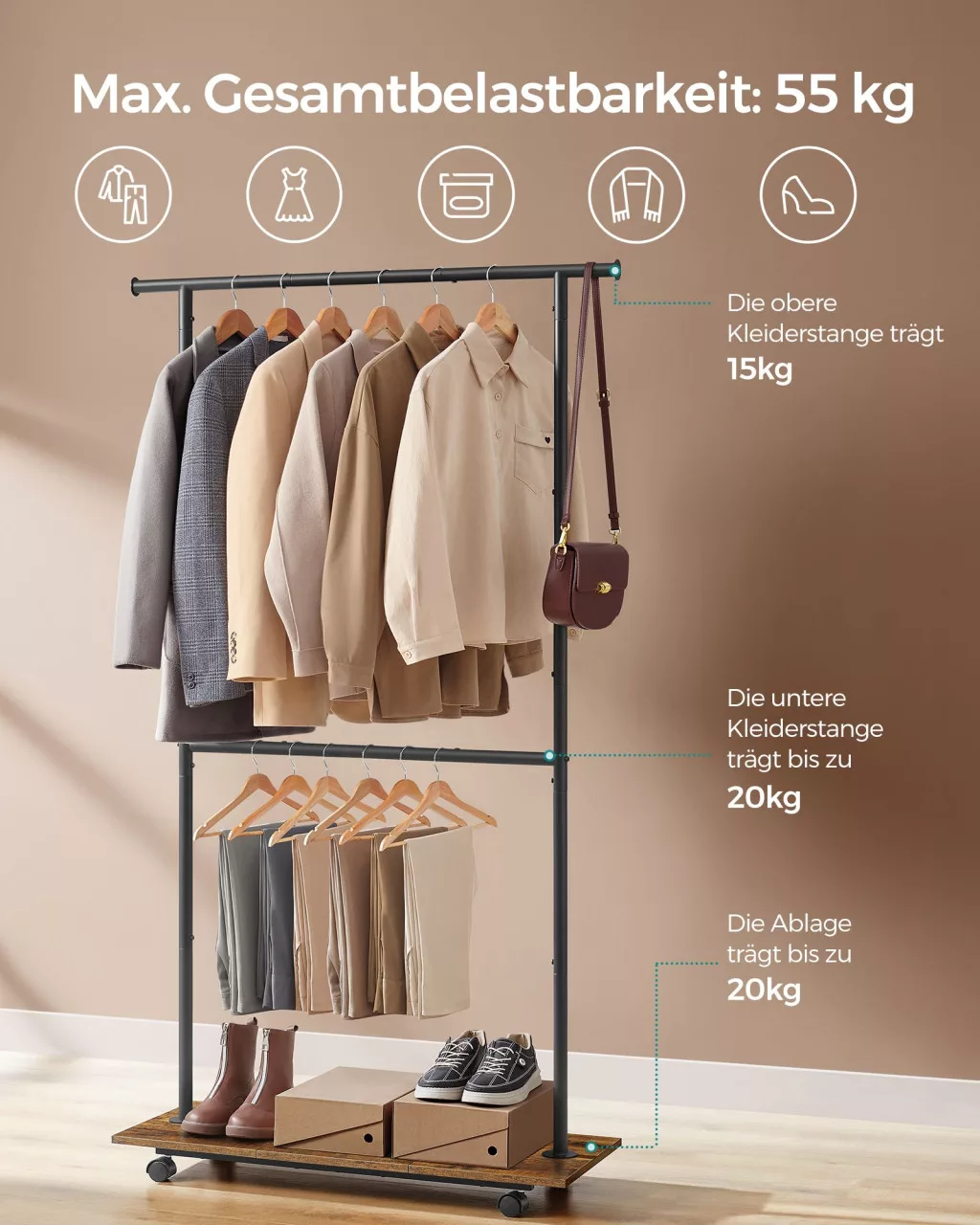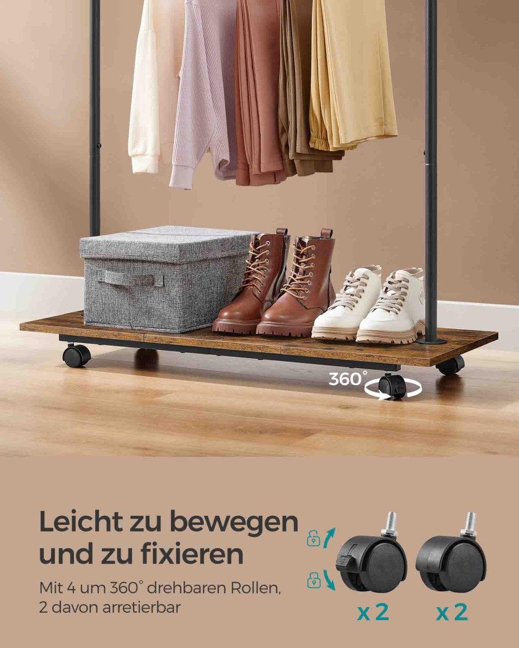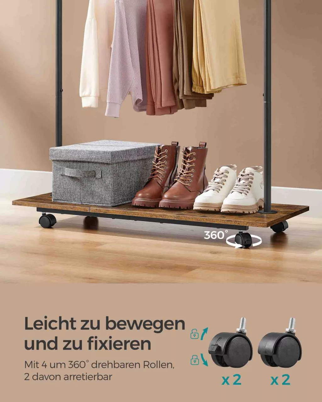 Ez a SONGMICS ruhaállvány ötvözi a funkcionalitást és az esztétikumot. A két akasztórúd és az alsó polc maximális tárolóhelyet biztosít, miközben a vintage barna és fekete színkombináció elegáns megjelenést kölcsönöz. Az állvány stabil acél szerkezete megbízható tartást nyújt kabátjainak, ruháinak és kiegészítőinek.