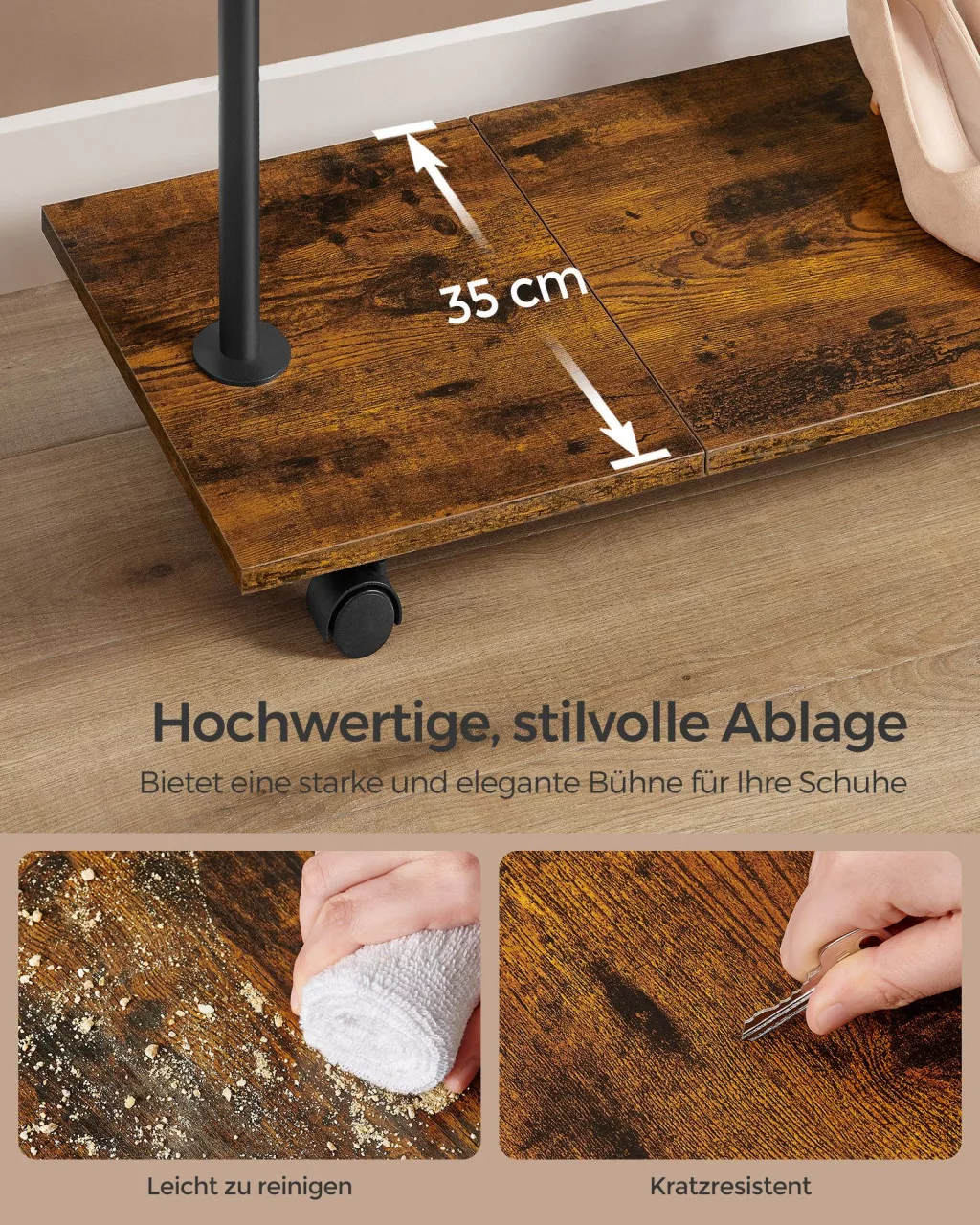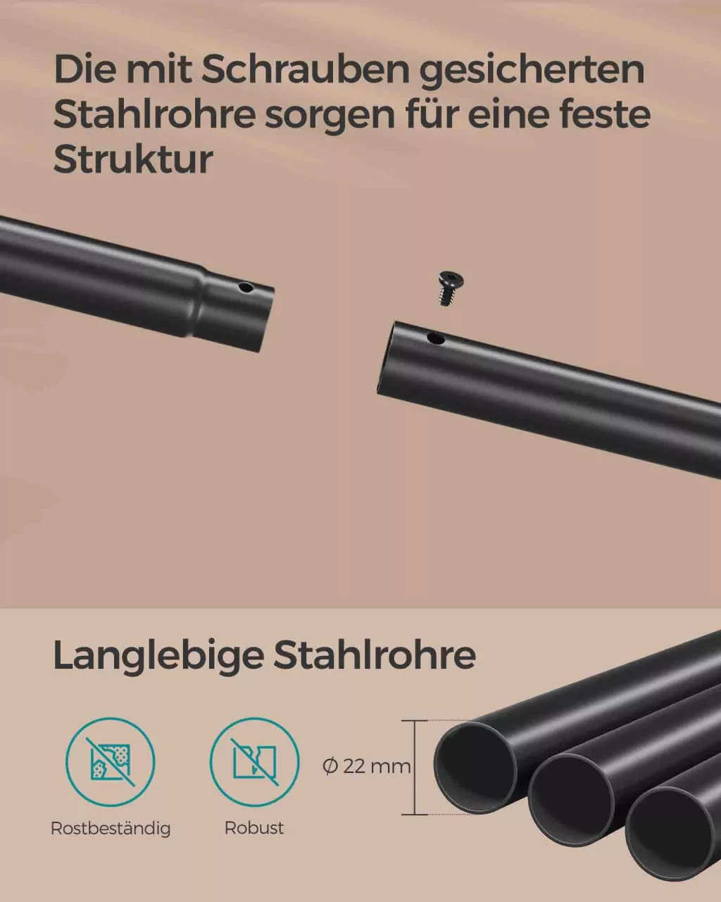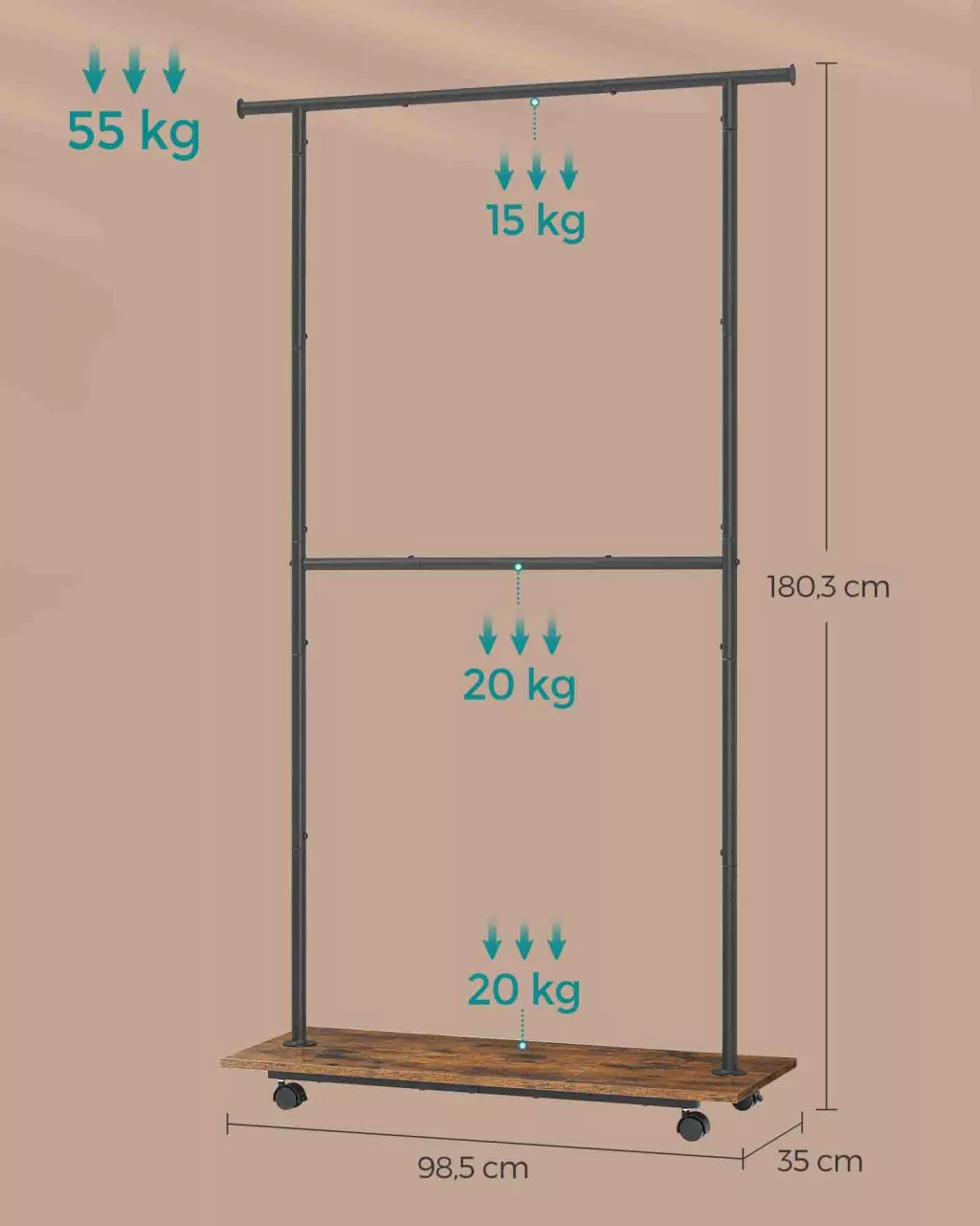 Ez a SONGMICS ruhaállvány ötvözi a funkcionalitást és az esztétikumot. A két akasztórúd és az alsó polc maximális tárolóhelyet biztosít, miközben a vintage barna és fekete színkombináció elegáns megjelenést kölcsönöz. Az állvány stabil acél szerkezete megbízható tartást nyújt kabátjainak, ruháinak és kiegészítőinek.