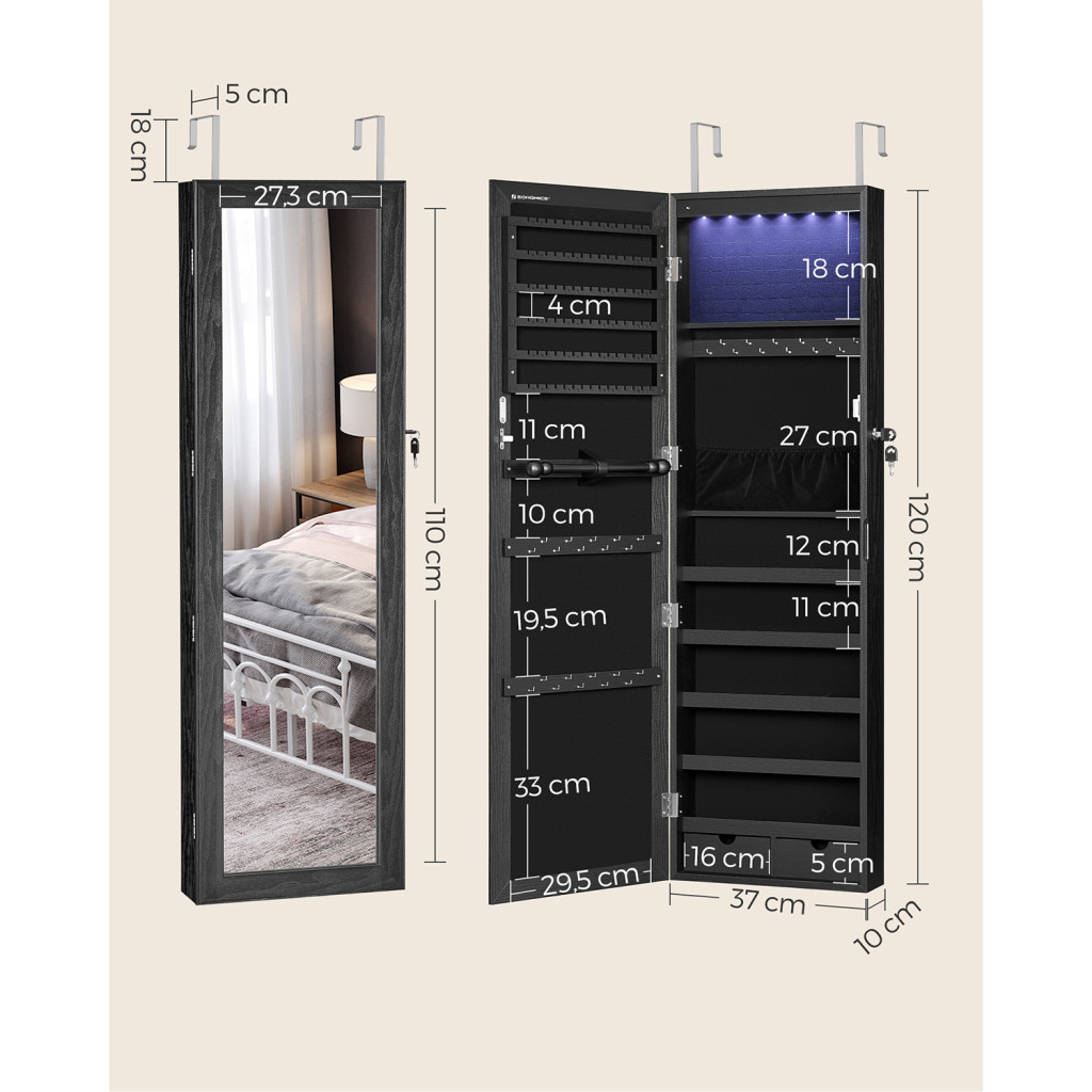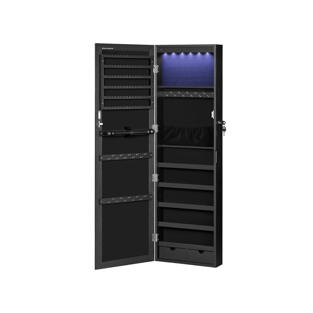 SONGMICS Zárható Ékszertároló Tükrös Szekrény Fekete LED Világítással