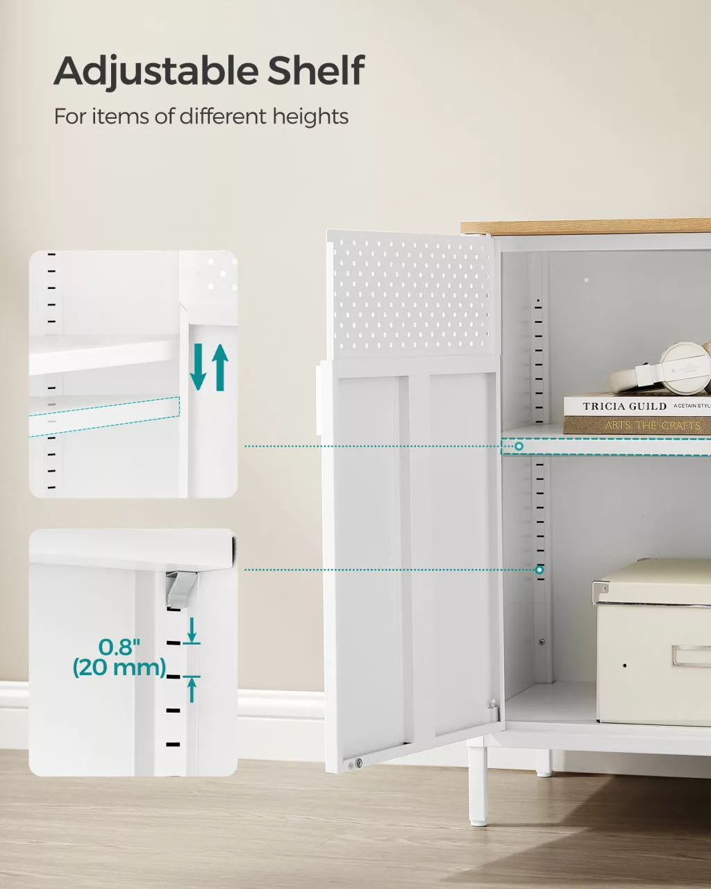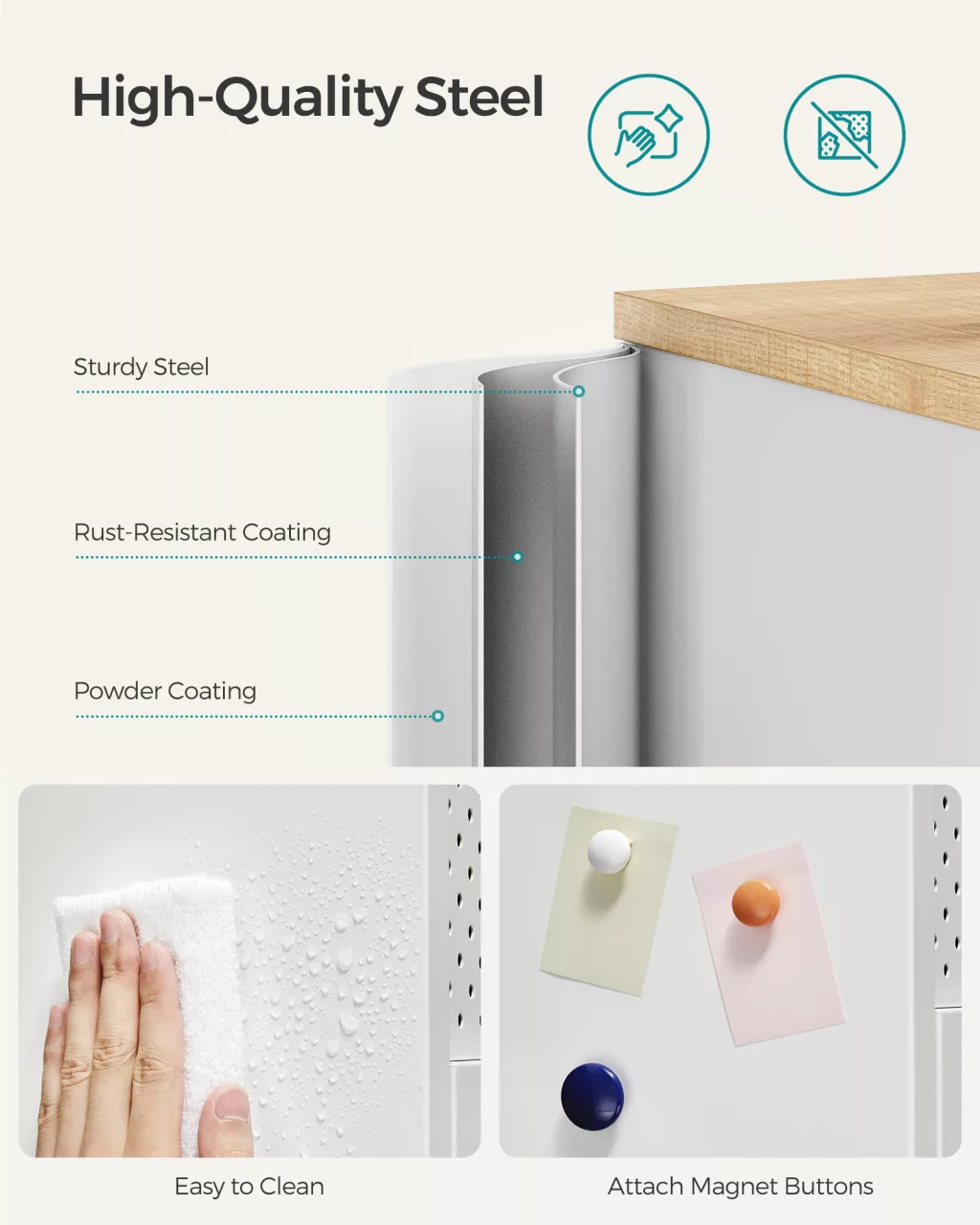 Ez a SONGMICS tárolószekrény a funkcionalitás és a modern dizájn tökéletes ötvözete. A fehér színű szekrény acél vázszerkezettel és forgácslap elemekkel készült, amely tartós és strapabíró megoldást nyújt. Az állítható polc lehetővé teszi, hogy különböző méretű tárgyakat tároljon, legyen szó könyvekről, irattartókról vagy akár jógatakarókról. A perforált ajtófelület nemcsak stílusos megjelenést kölcsönöz, hanem kiváló szellőzést is biztosít a tárolt tárgyak számára.