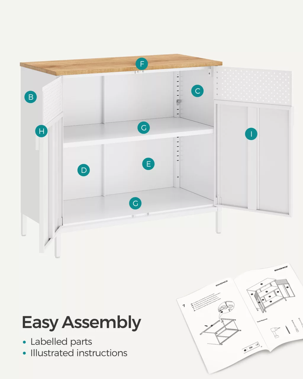 A szekrény sokoldalúsága révén számos helyiségben megállja a helyét: használhatja komódként az étkezőben, TV-állványként a nappaliban, vagy tárolóként az irodában. A felső lap akár 50 kg terhelést is elbír, így dekorációs tárgyak, növények vagy kisebb elektronikai eszközök elhelyezésére is alkalmas. A világos utasítások és címkézett alkatrészek gyors és egyszerű összeszerelést tesznek lehetővé, így hamar élvezheti új tárolómegoldását.