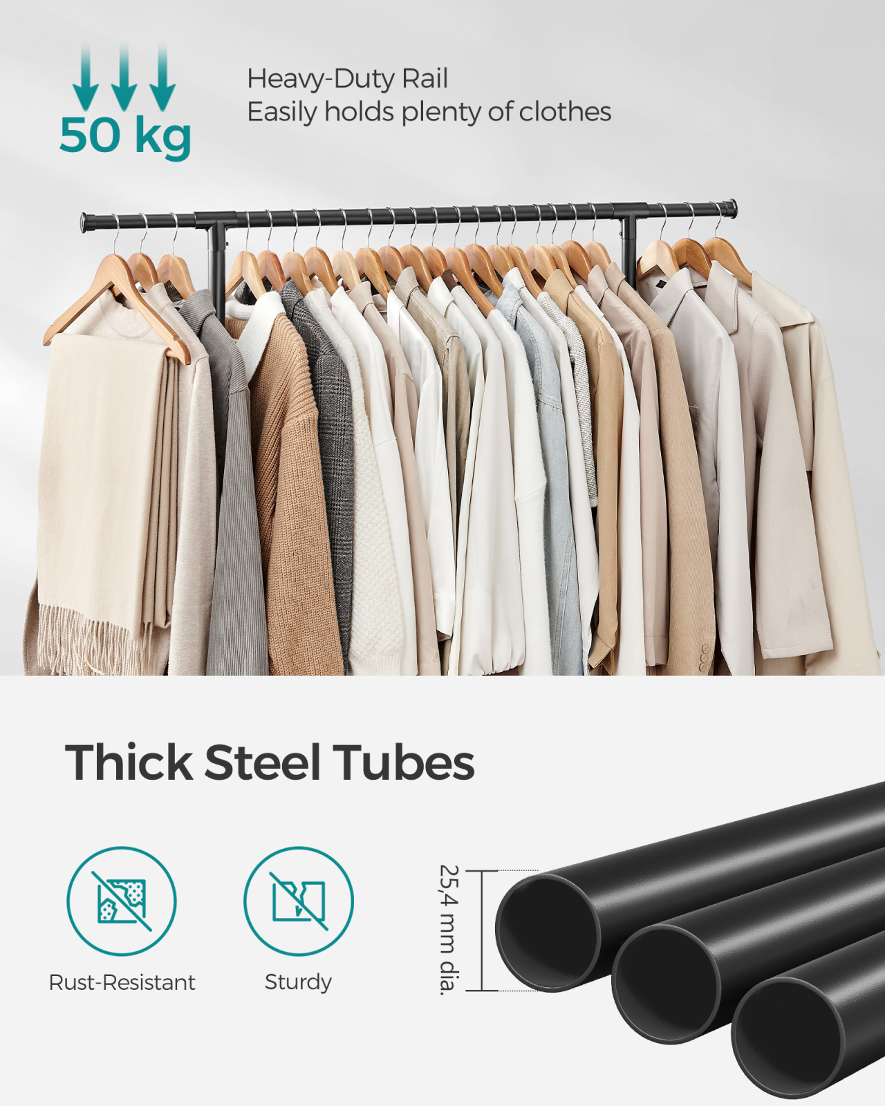 • Masszív acél konstrukció: Az erős acélcsövek 50 kg összteherbírást biztosítanak, így még a nehéz télikabátok is biztonságosan tárolhatók anélkül, hogy az állvány meghajolna