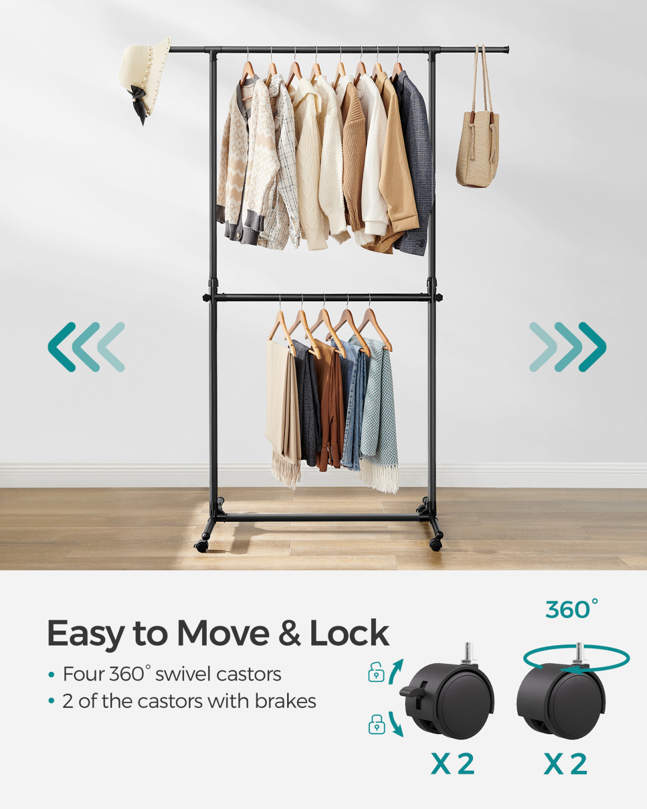 Maximalizálja ruhatároló helyét ezzel a praktikus dupla ruhásállvánnyal, amely magasságban állítható, kihúzható felső rúddal és görgőkkel rendelkezik a könnyű mozgathatóság érdekében.