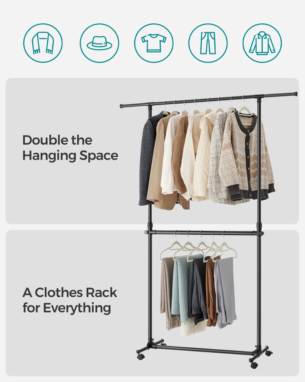 • Dupla tárolókapacitás: Két rúd biztosítja a kétszeres tárolóhelyet, így több ruhadarab rendezhető el rendezetten és könnyen hozzáférhetően