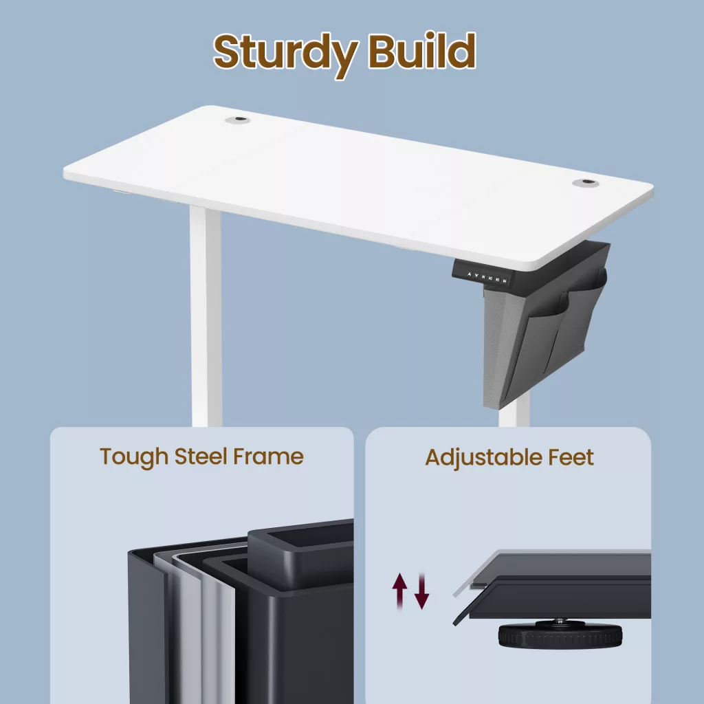 Az átgondolt kialakítás praktikus tárolómegoldásokat kínál: az oxford szövet zseb tárolja irodai kellékeit, a beépített akasztó fejhallgatója vagy táskája számára, míg a kábelnyílások segítenek elrejteni a vezetékeket. A beépített ütközésérzékelő biztonsági rendszer megvédi eszközeit a magasságállítás során. Az egyszerű összeszerelés és a tiszta, fehér design tökéletesen illeszkedik bármilyen otthoni irodai környezetbe.