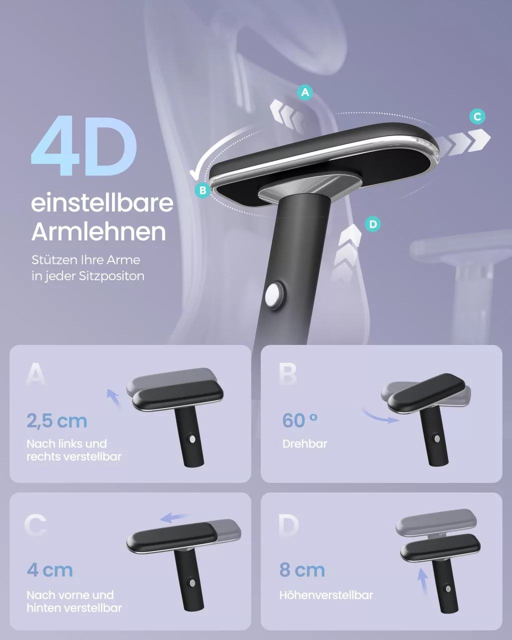 • 4D kartámaszok: Négy irányban állíthatók (magasság, szélesség, mélység, szög), így optimális támasztást nyújtanak a karoknak és vállaknak, csökkentve a feszültséget