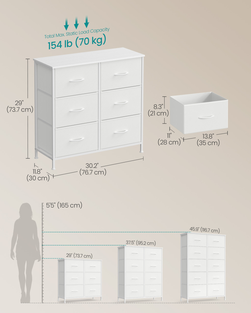 Ez a SONGMICS fiókos szekrény tökéletes választás azok számára, akik praktikus és elegáns tárolási megoldást keresnek otthonukba. A modern, letisztult fehér dizájn bármilyen berendezési stílushoz illeszkedik, legyen szó hálószobáról, gardróbról, előszobáról vagy nappaliról. A 6 tágas textil fiók bőséges helyet biztosít ruházat, fehérnemű, kiegészítők és egyéb személyes tárgyak rendezett tárolására, míg a felső lap ideális lámpák, órák vagy dekorációs elemek elhelyezésére.