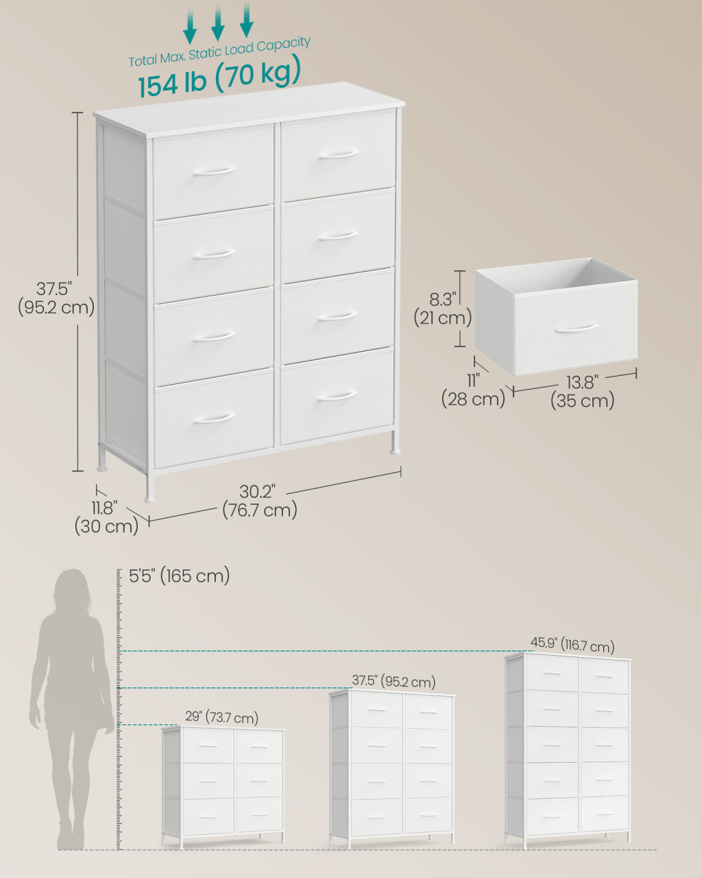 Ez a SONGMICS fiókos szekrény tökéletes választás azok számára, akik praktikus és elegáns tárolási megoldást keresnek otthonukba. A 8 tágas fiók bőséges helyet biztosít ruházat, fehérnemű, kiegészítők és egyéb személyes tárgyak rendezett tárolására. A modern, fehér színvilág bármilyen lakberendezési stílushoz illeszkedik, legyen szó hálószobáról, gardróbról, előszobáról vagy akár nappaliról.